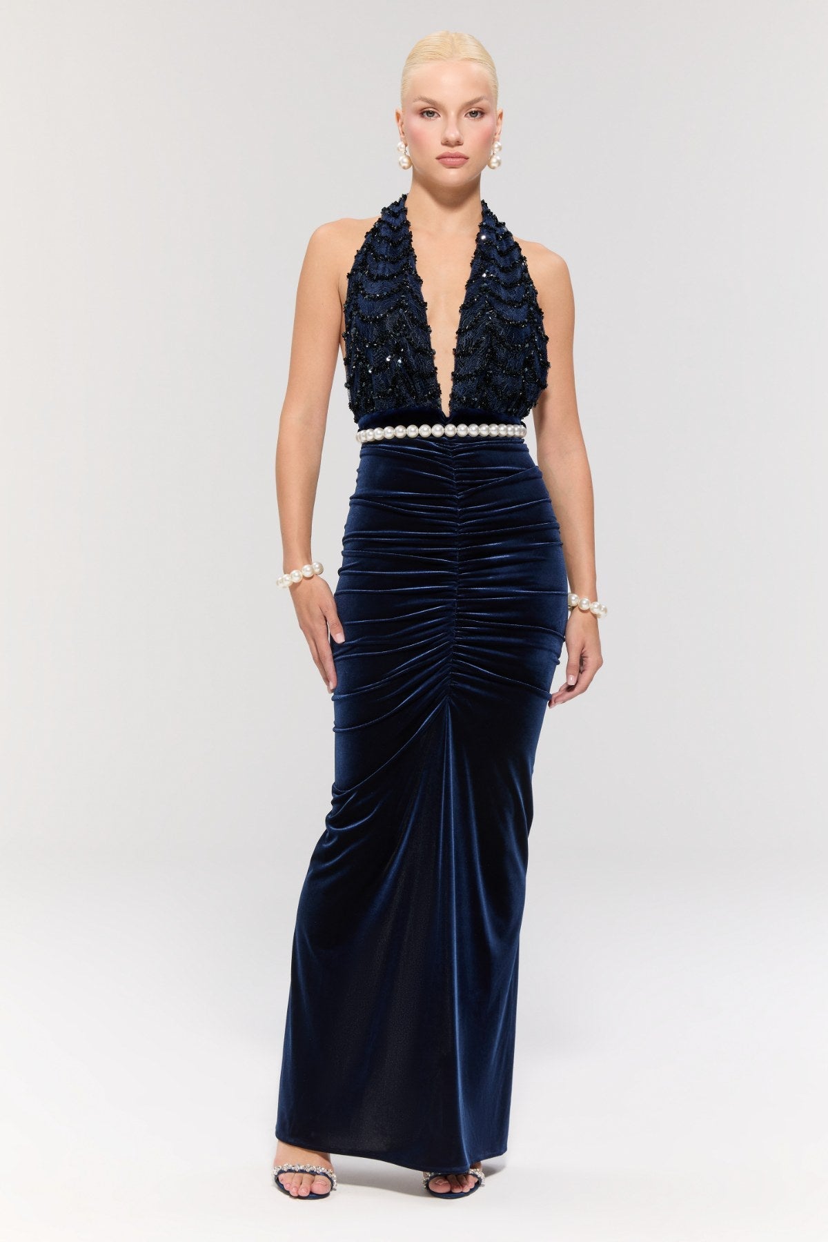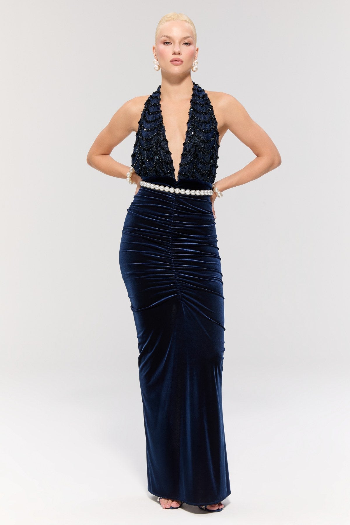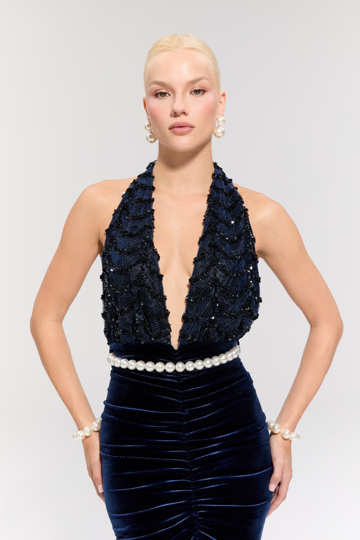 The navy blue velvet texture exudes a touch of elegance, while the pearl belt at the waist adds a touch of elegance.