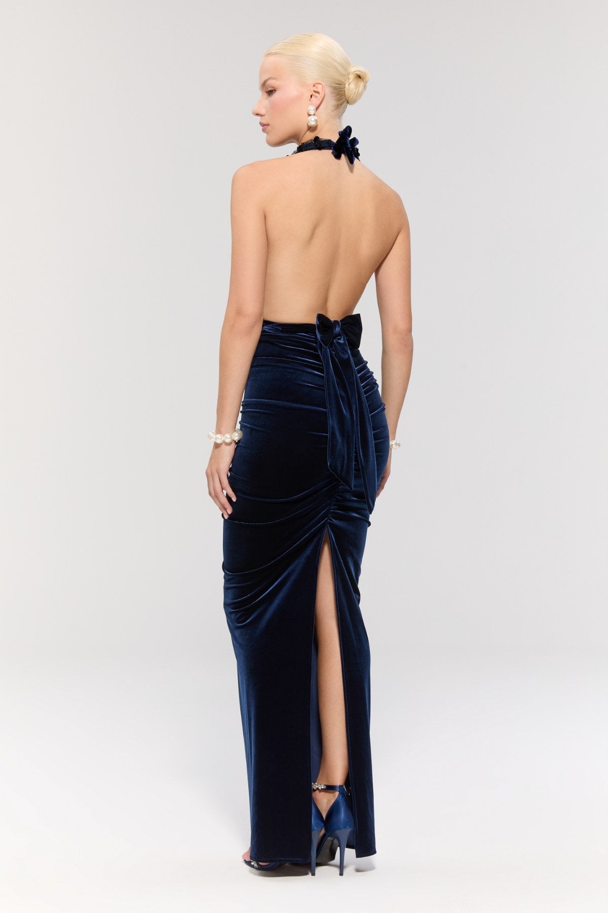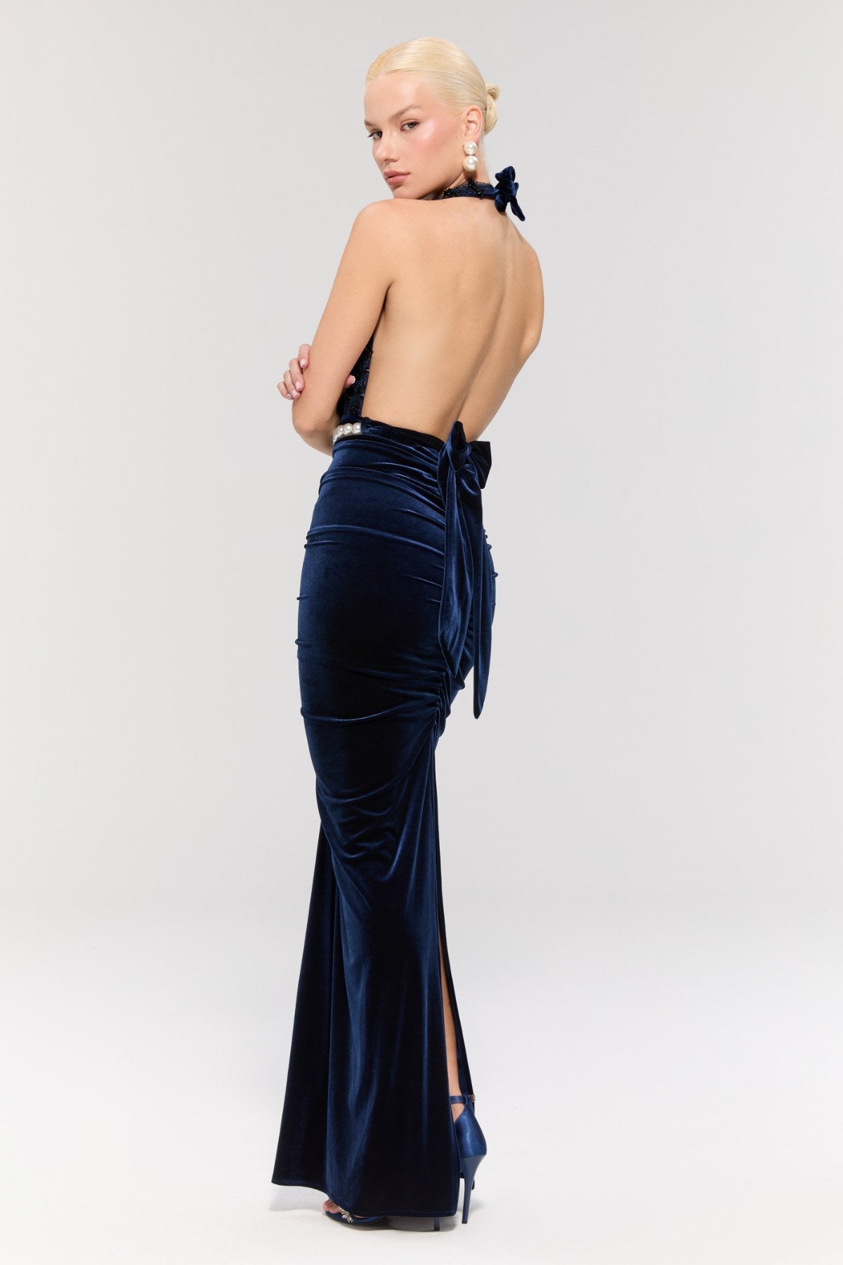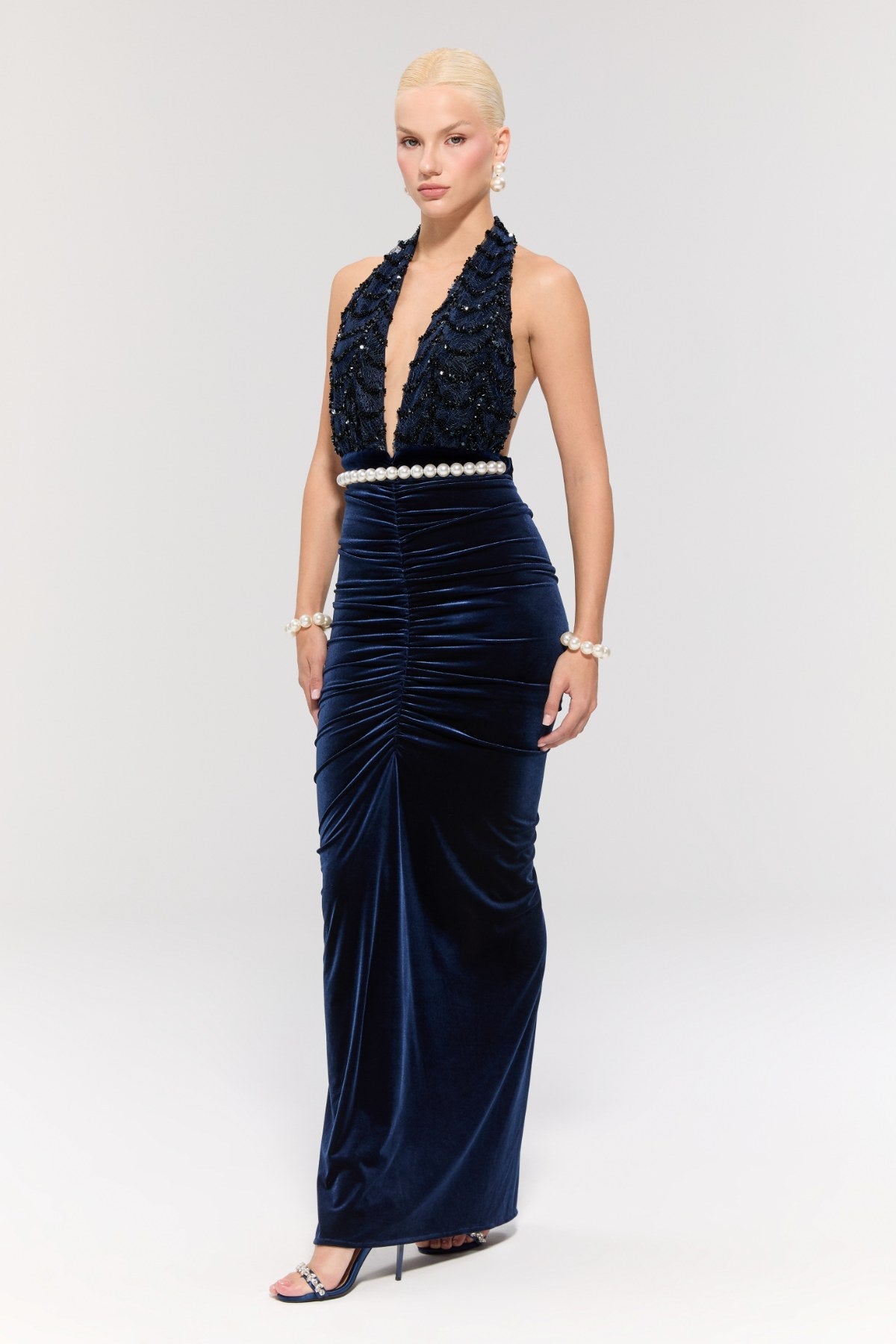 The navy blue velvet texture exudes a touch of elegance, while the pearl belt at the waist adds a touch of elegance.