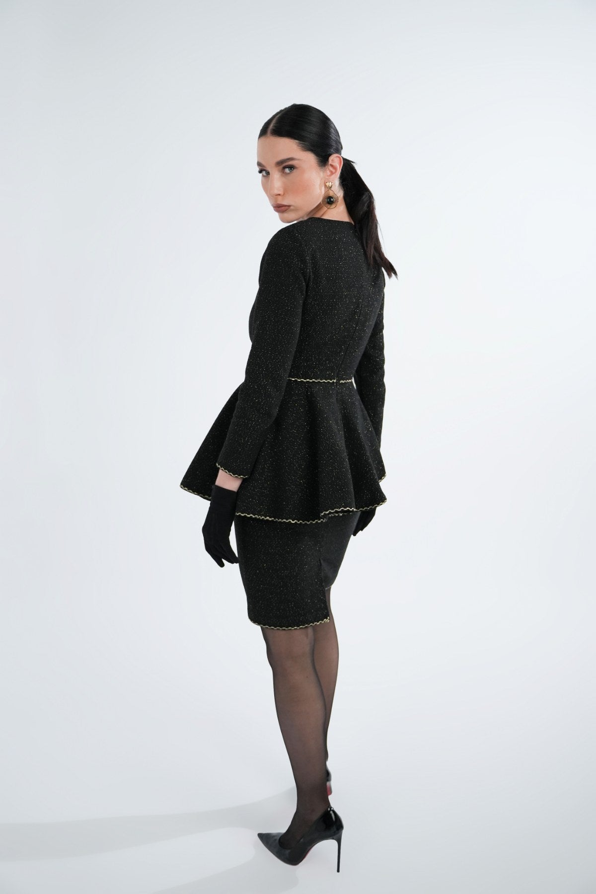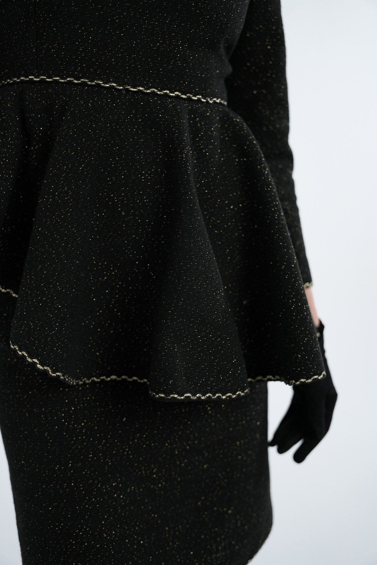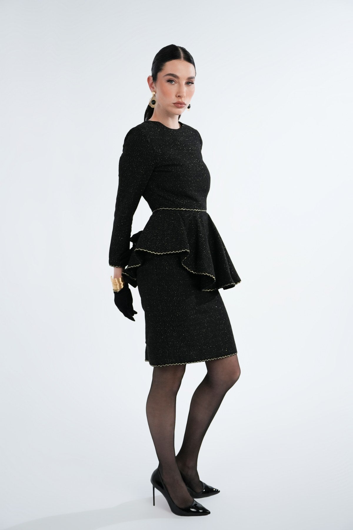 Dress with piping, ruffles, and gold embroidery on a black tweed fabric