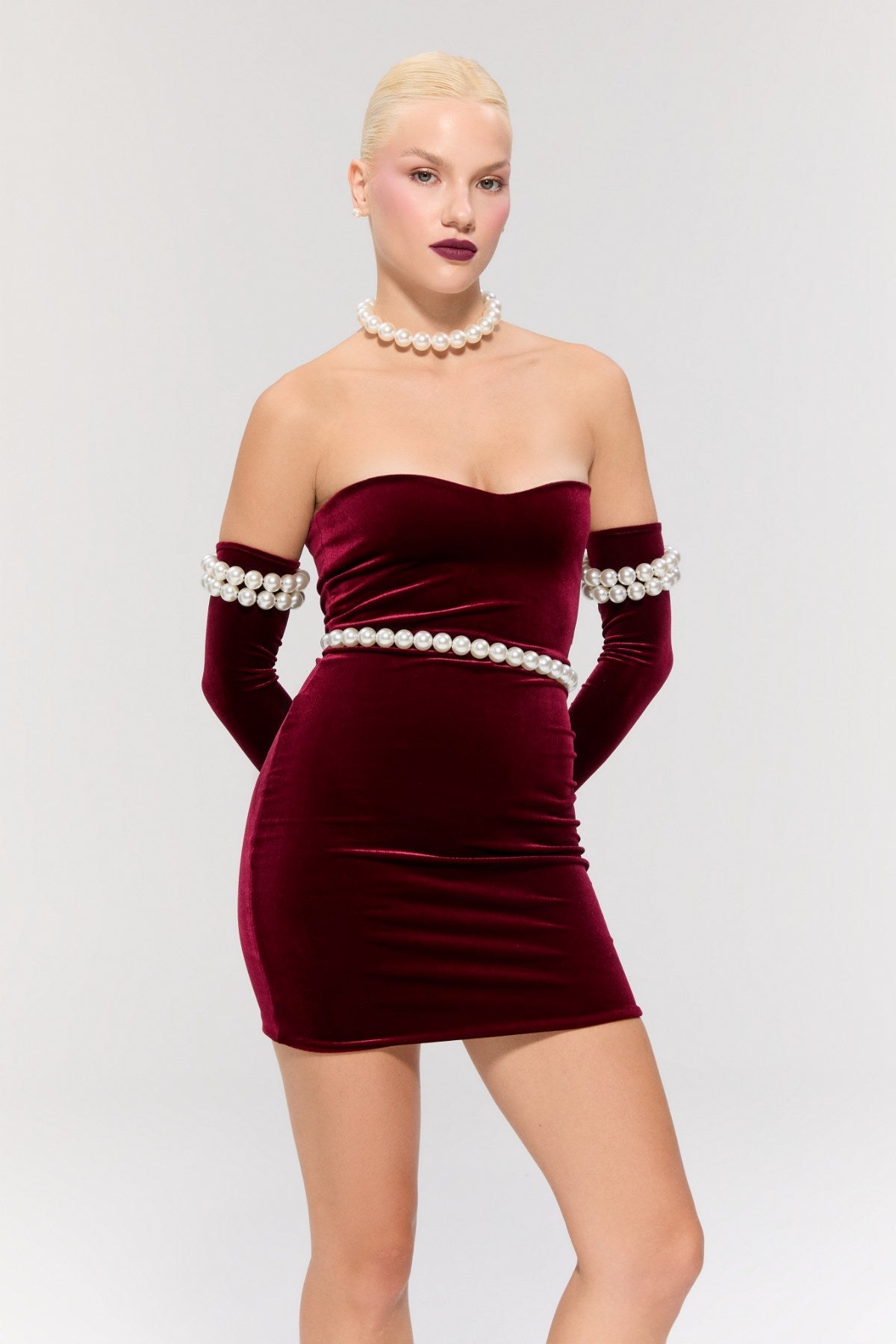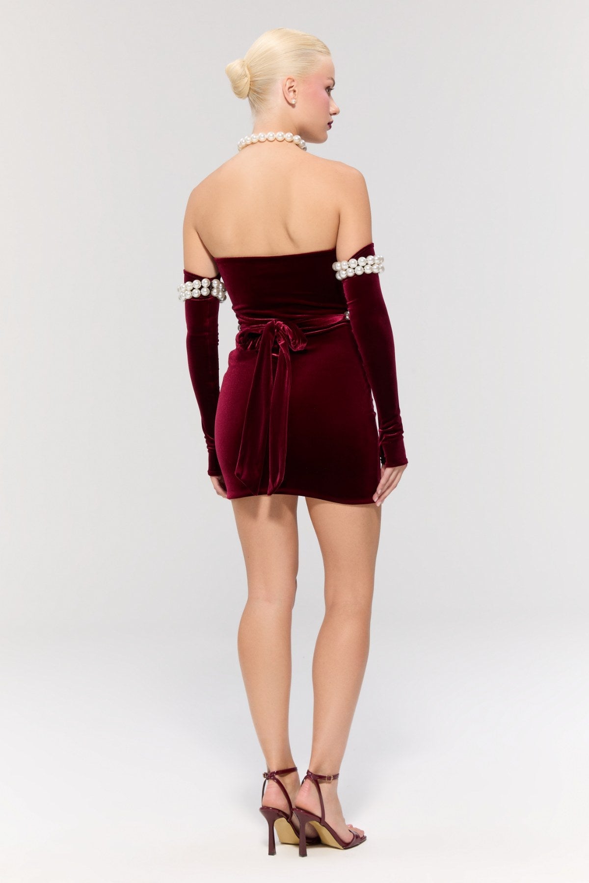 The dress offers a chic and modern silhouette with its mini length and burgundy velvet fabric.