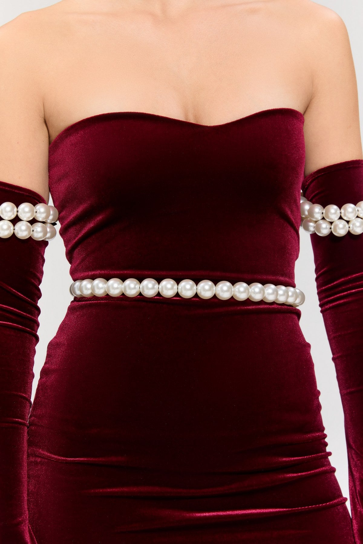 A pearl belt detail at the waist adds a touch of elegance, while long pearl-detailed gloves complete the look.