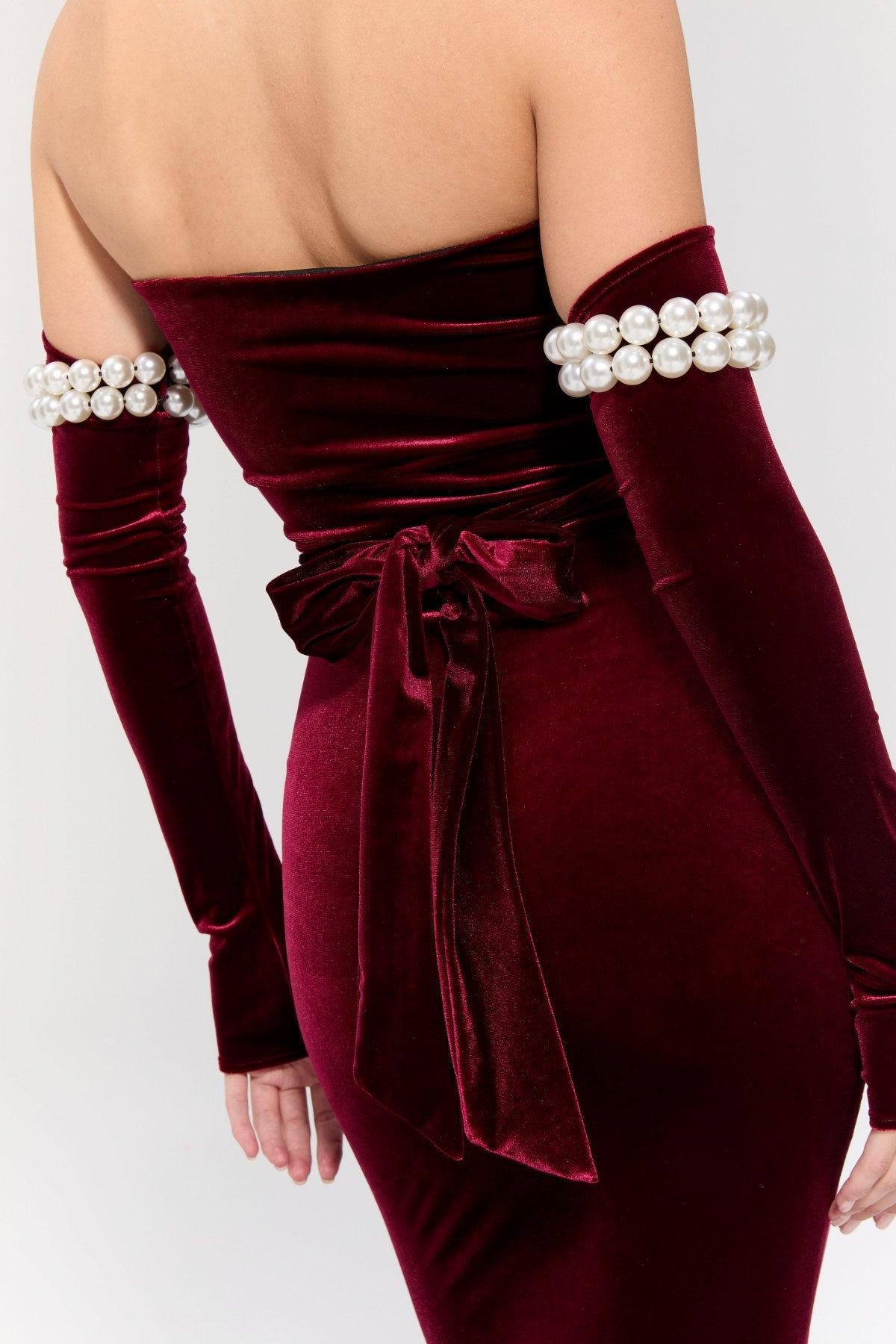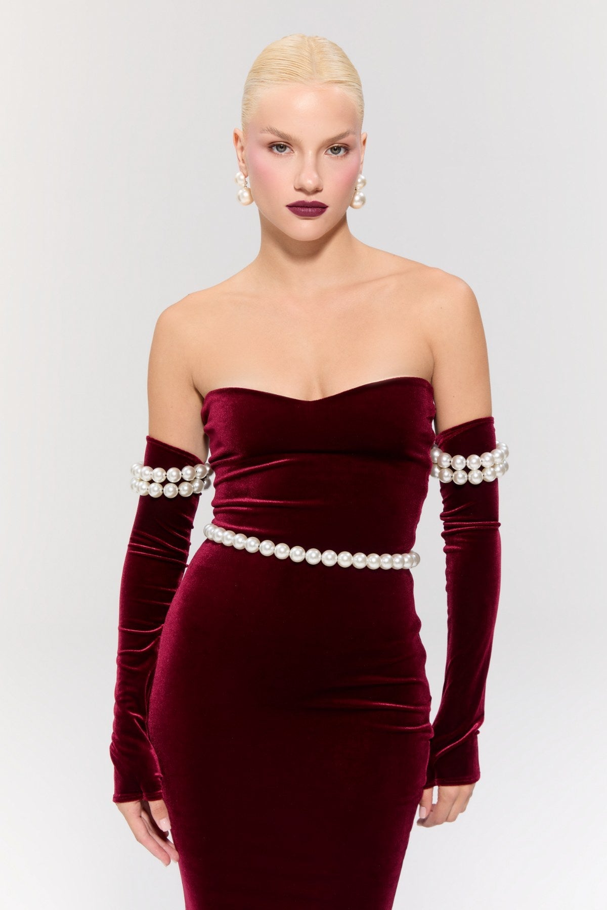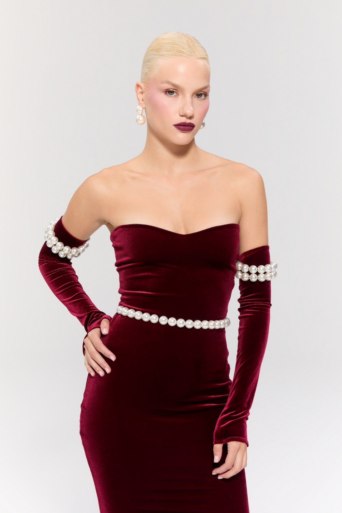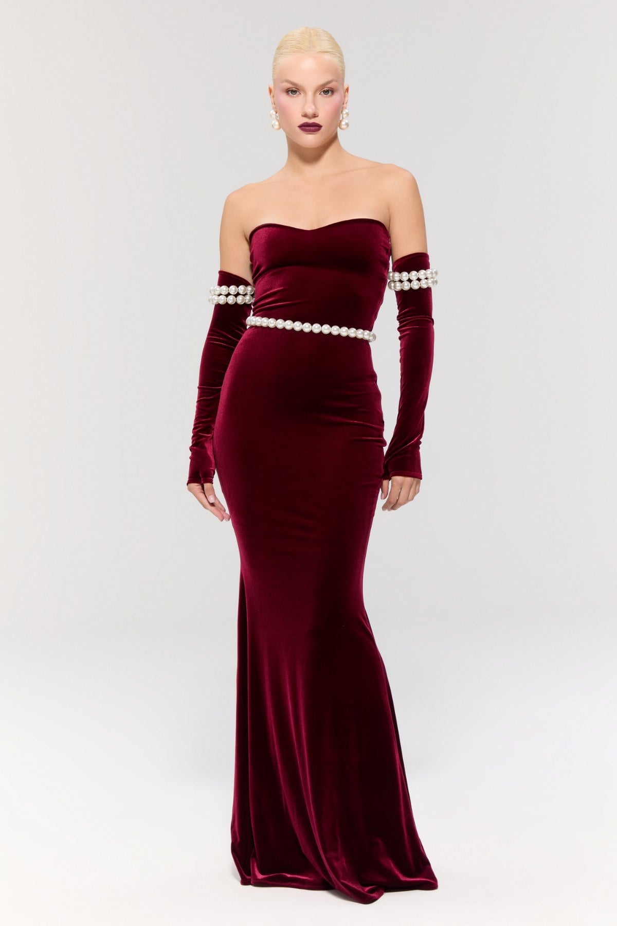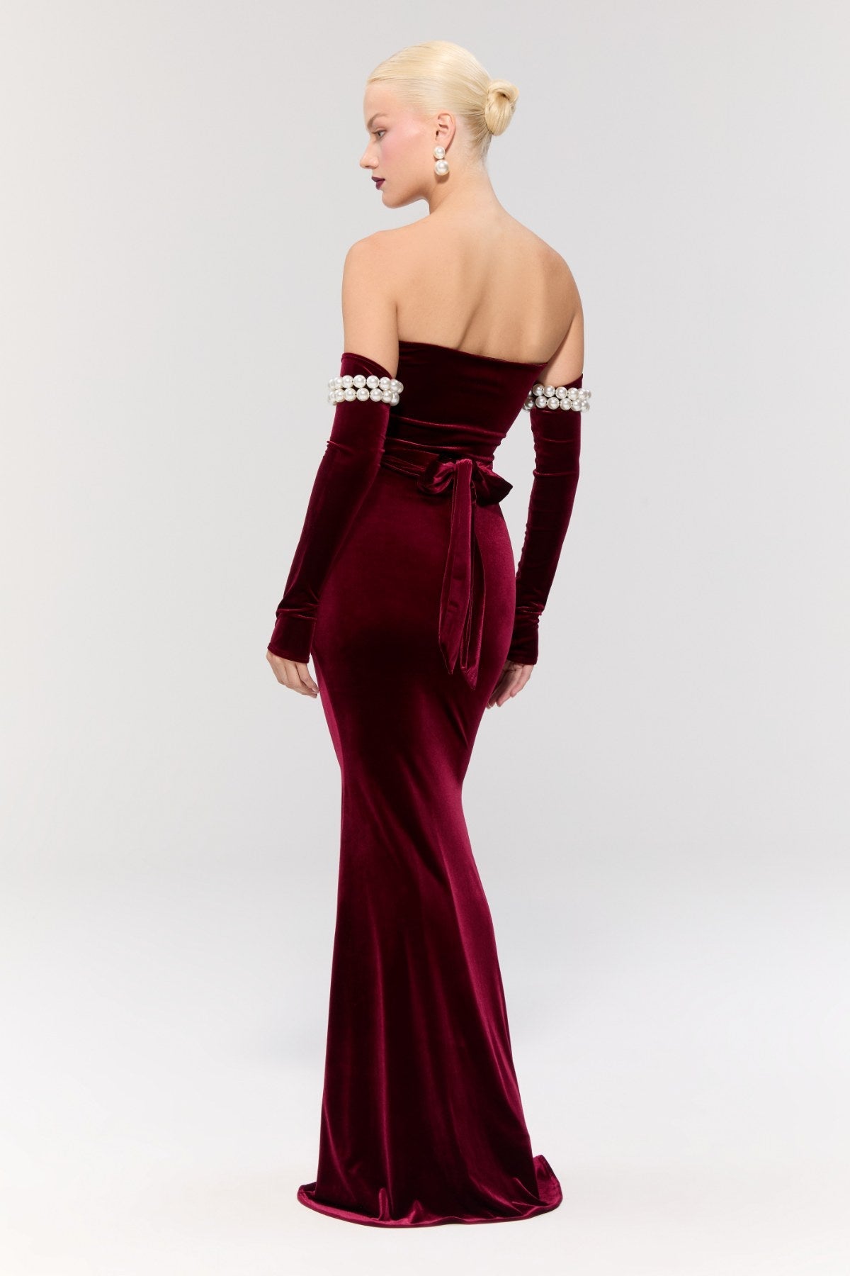 The dress offers an elegant and sophisticated silhouette with its long burgundy velvet design.