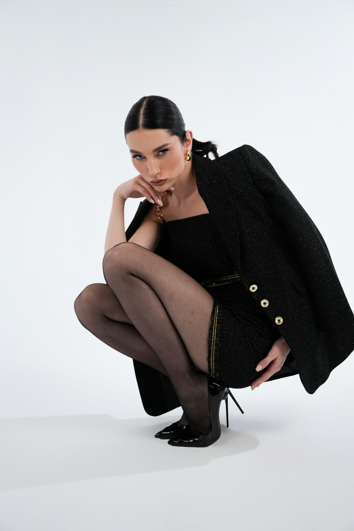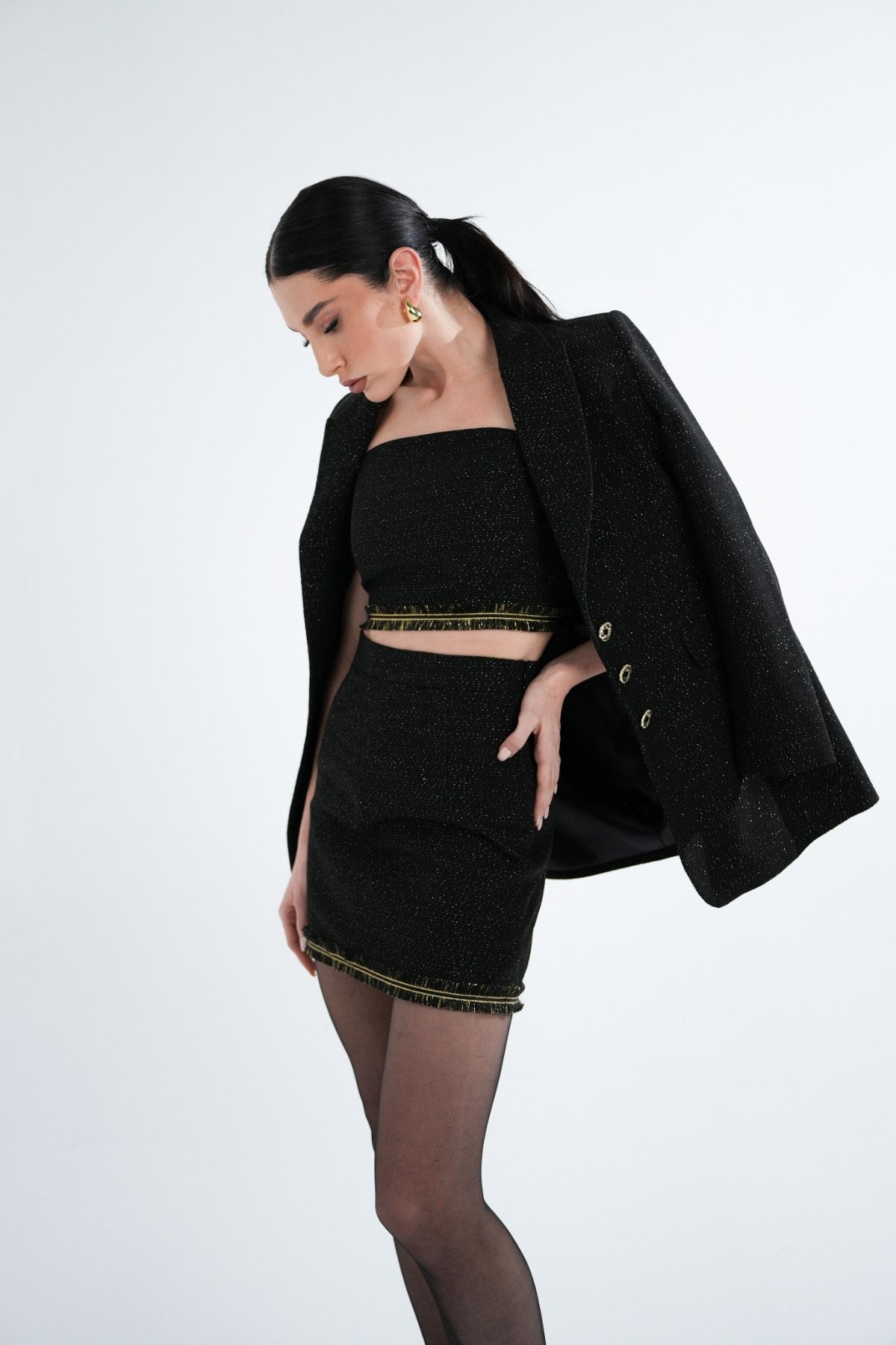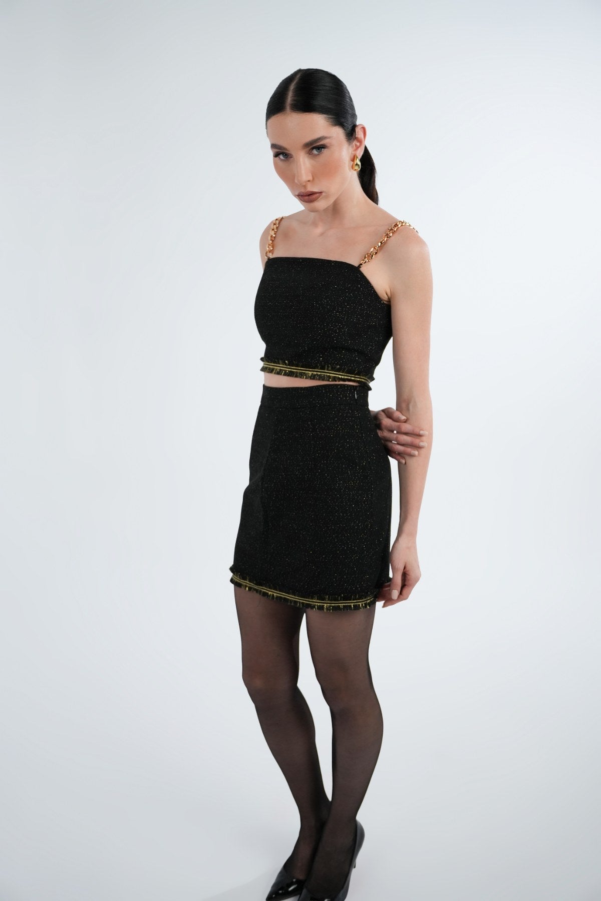 Black and gold bustier with gold chain and tassel detail.