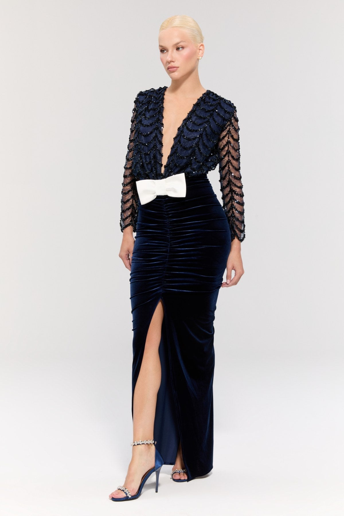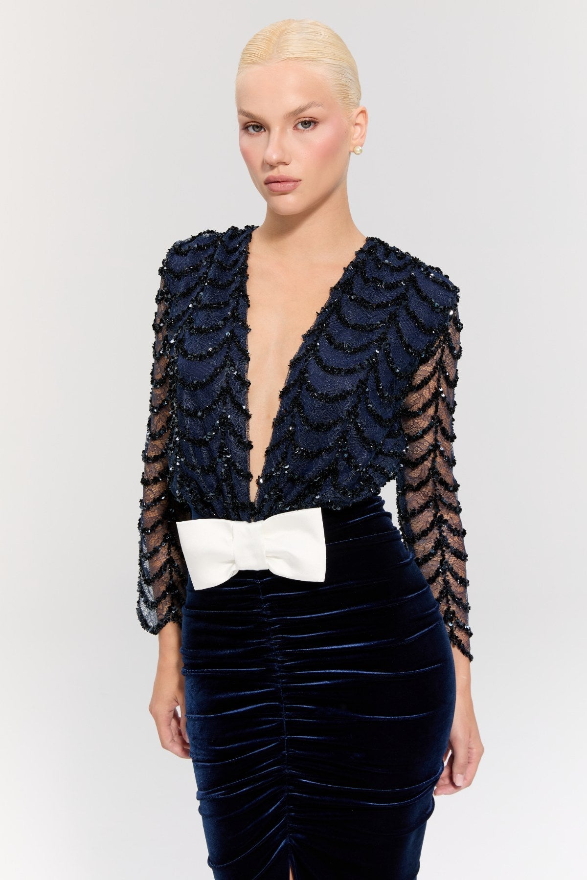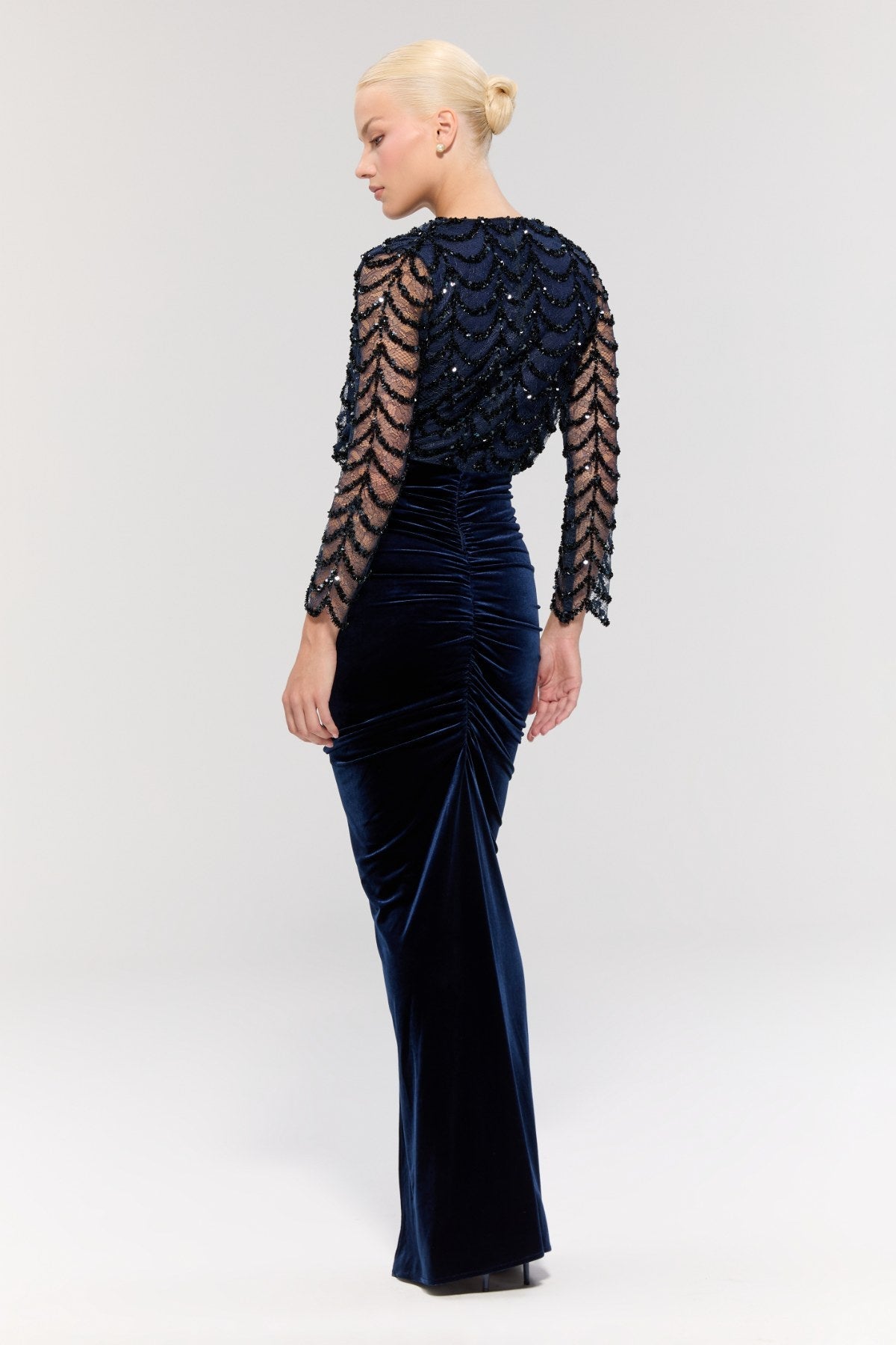 The dress's navy blue sequined fabric on top creates a sparkling and glamorous look, while the navy blue velvet texture on the bottom adds a sophisticated touch.