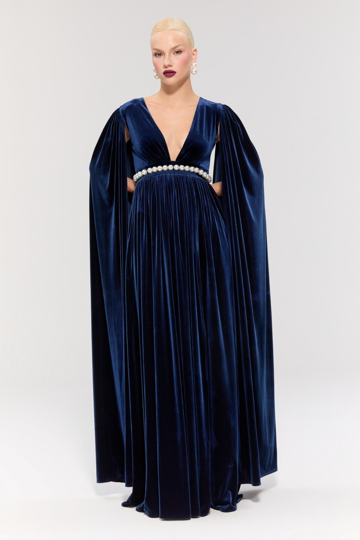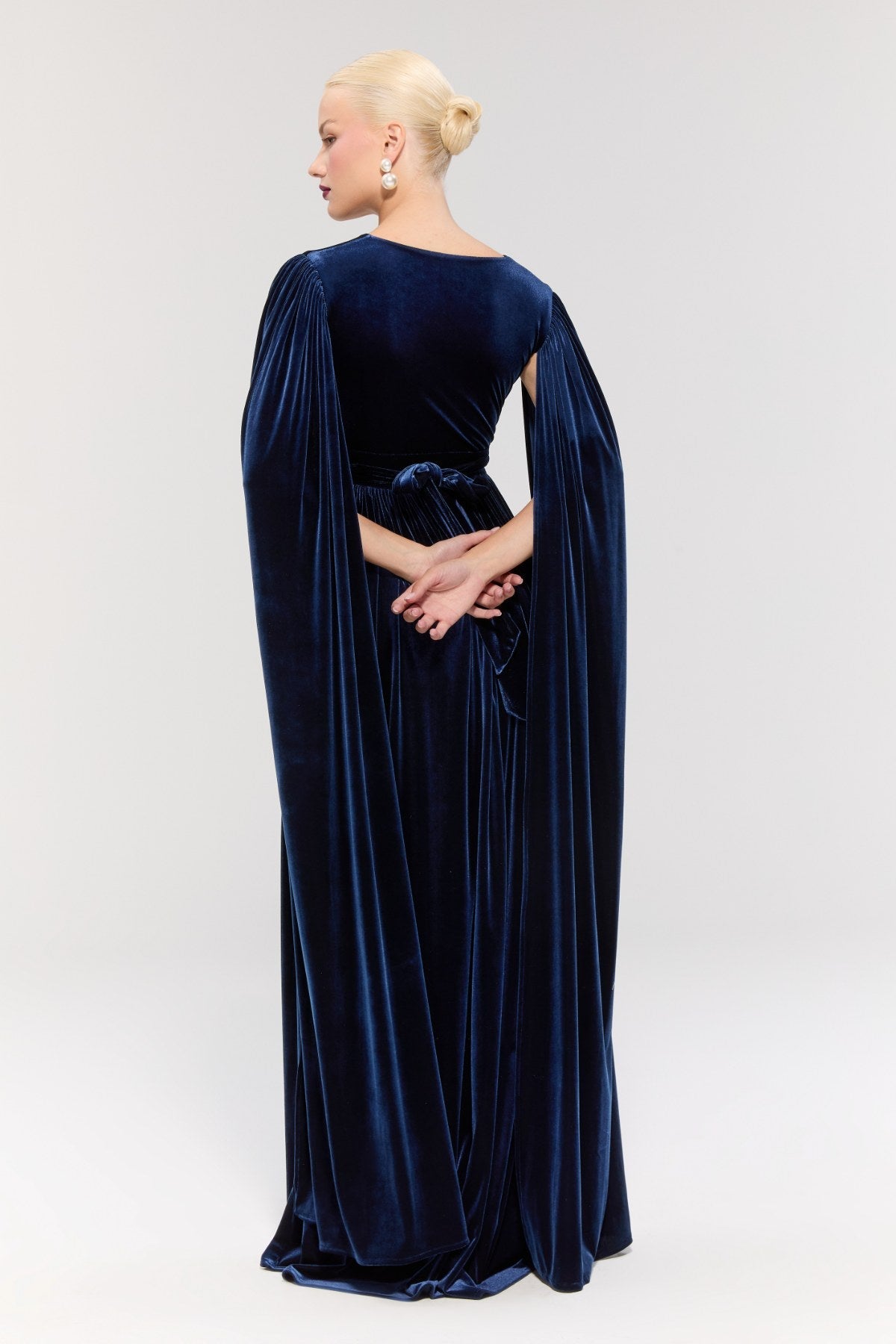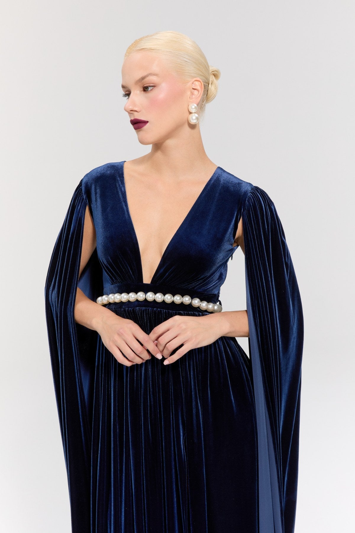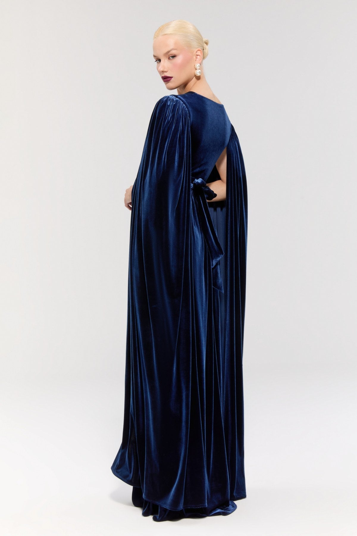 The dress, with its long cape draped over both shoulders and navy blue velvet fabric, offers an elegant and sophisticated look.