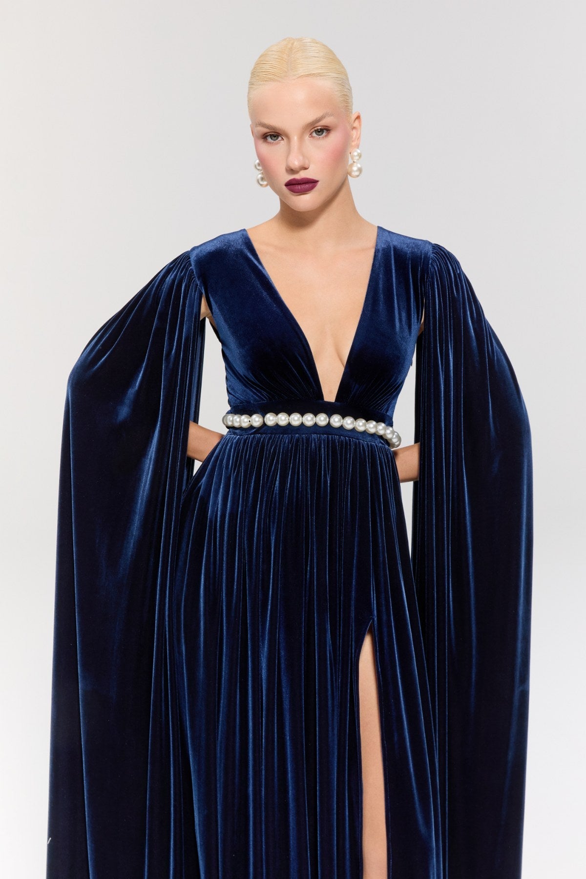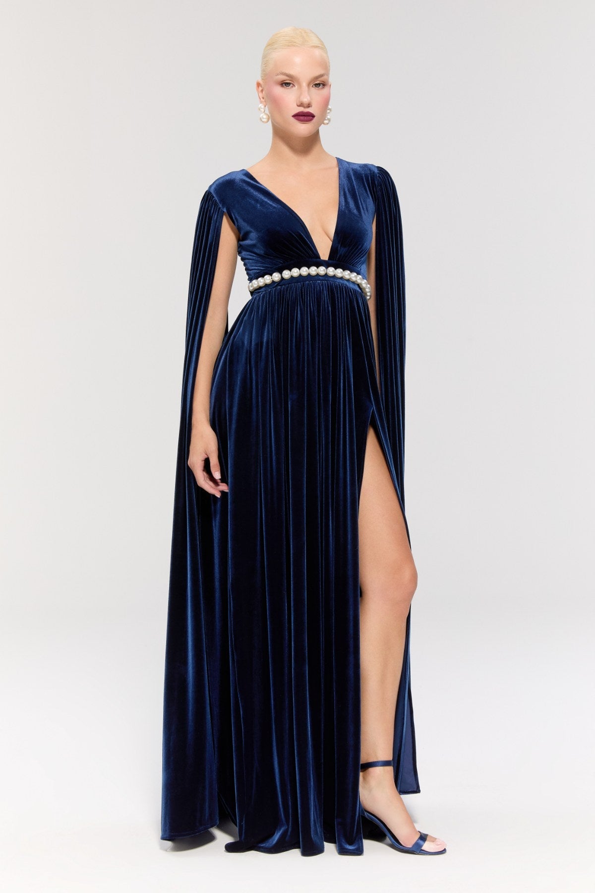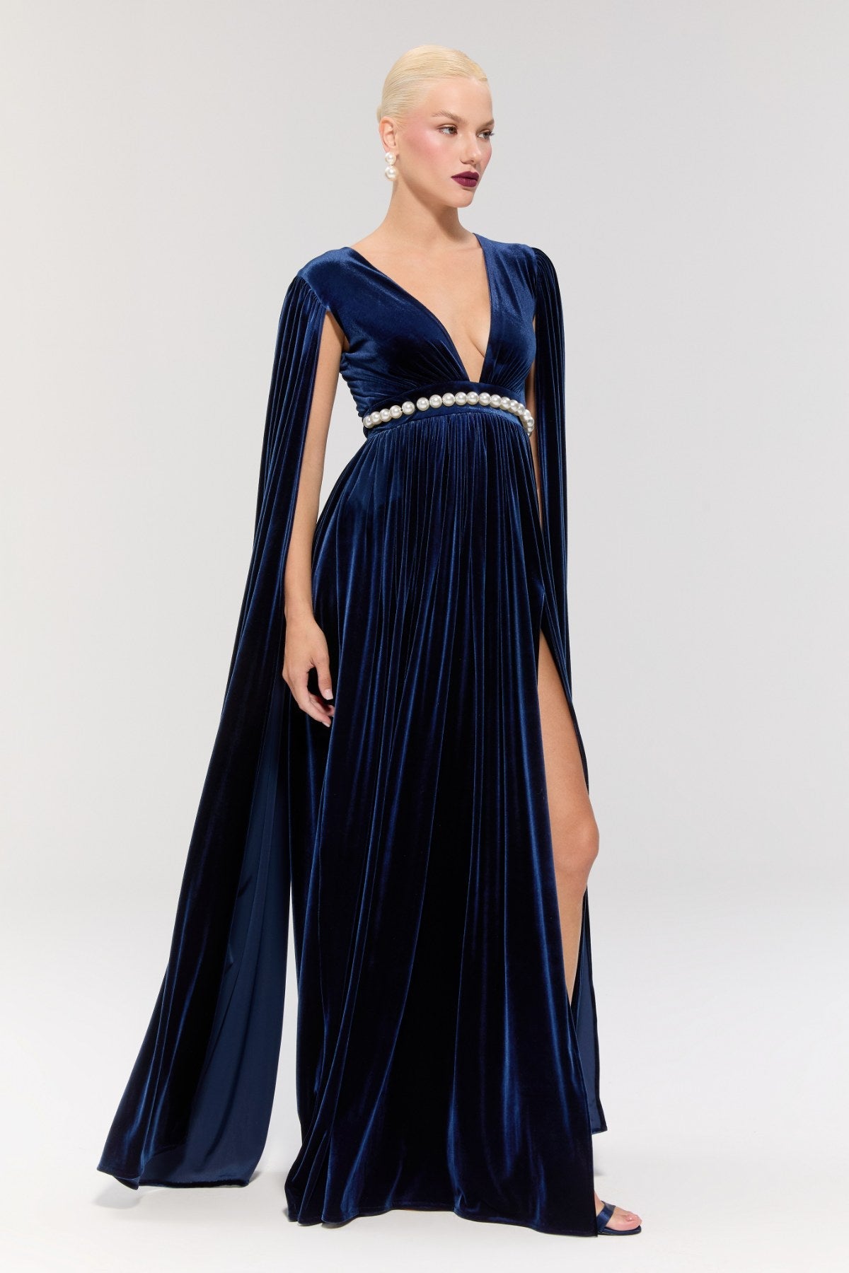 The dress, with its long cape draped over both shoulders and navy blue velvet fabric, offers an elegant and sophisticated look.