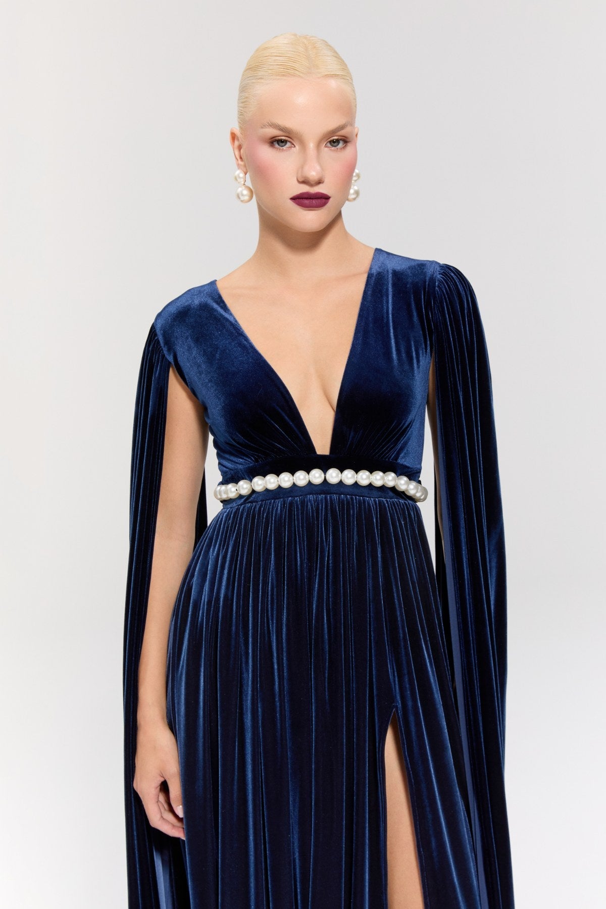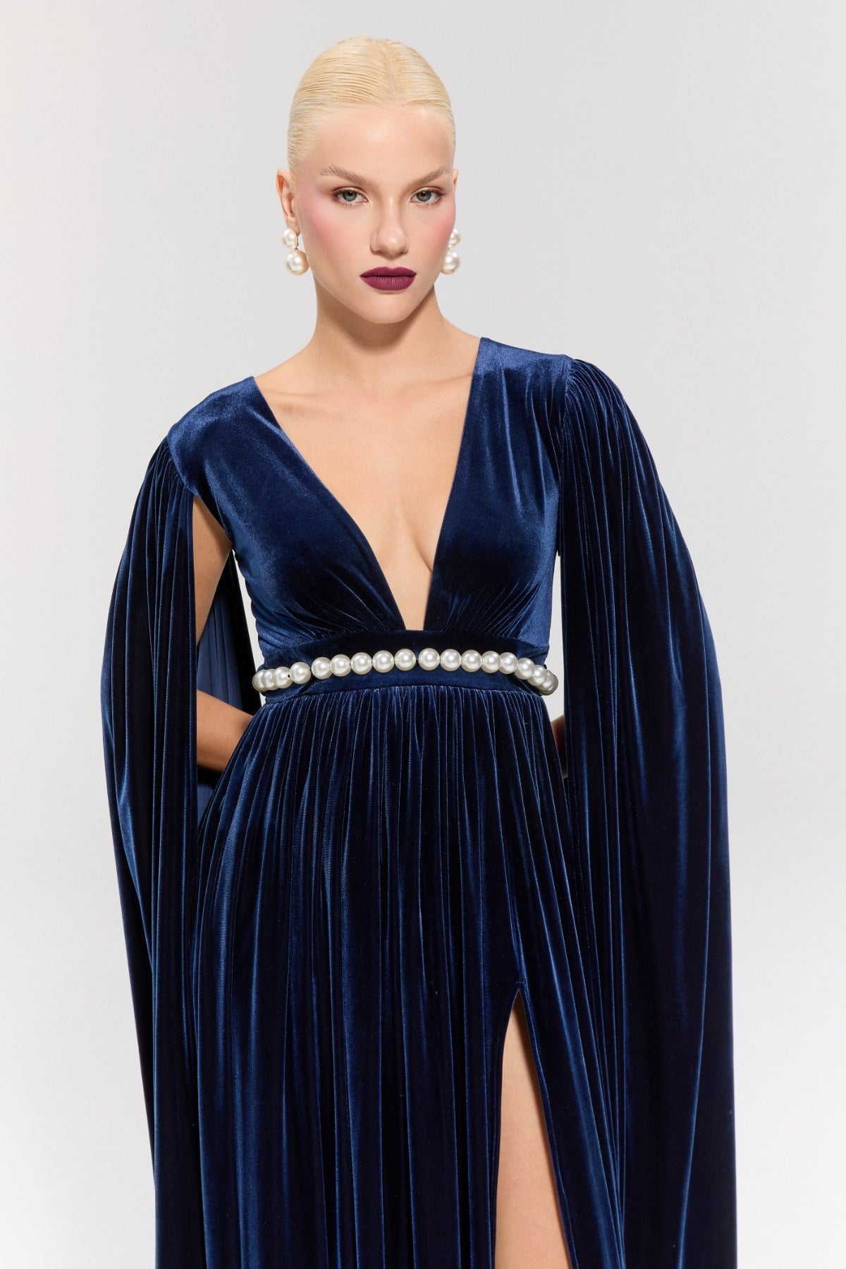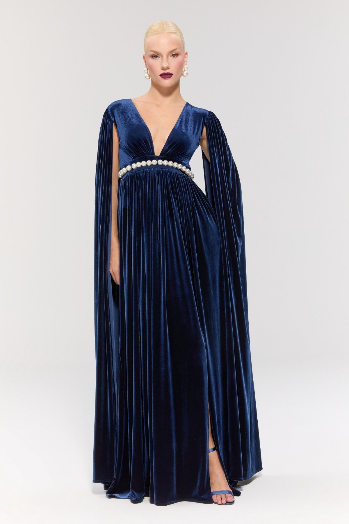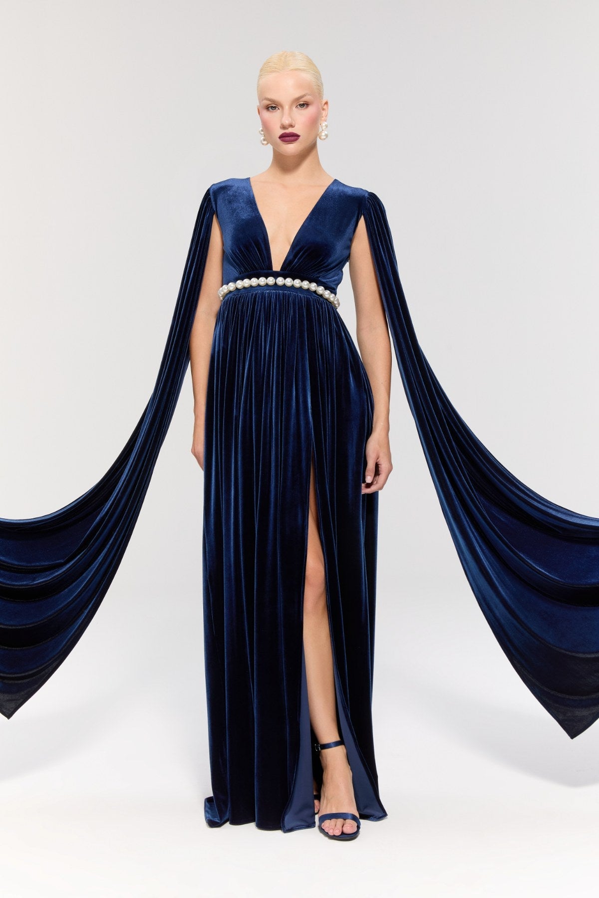 The dress, with its long cape draped over both shoulders and navy blue velvet fabric, offers an elegant and sophisticated look.