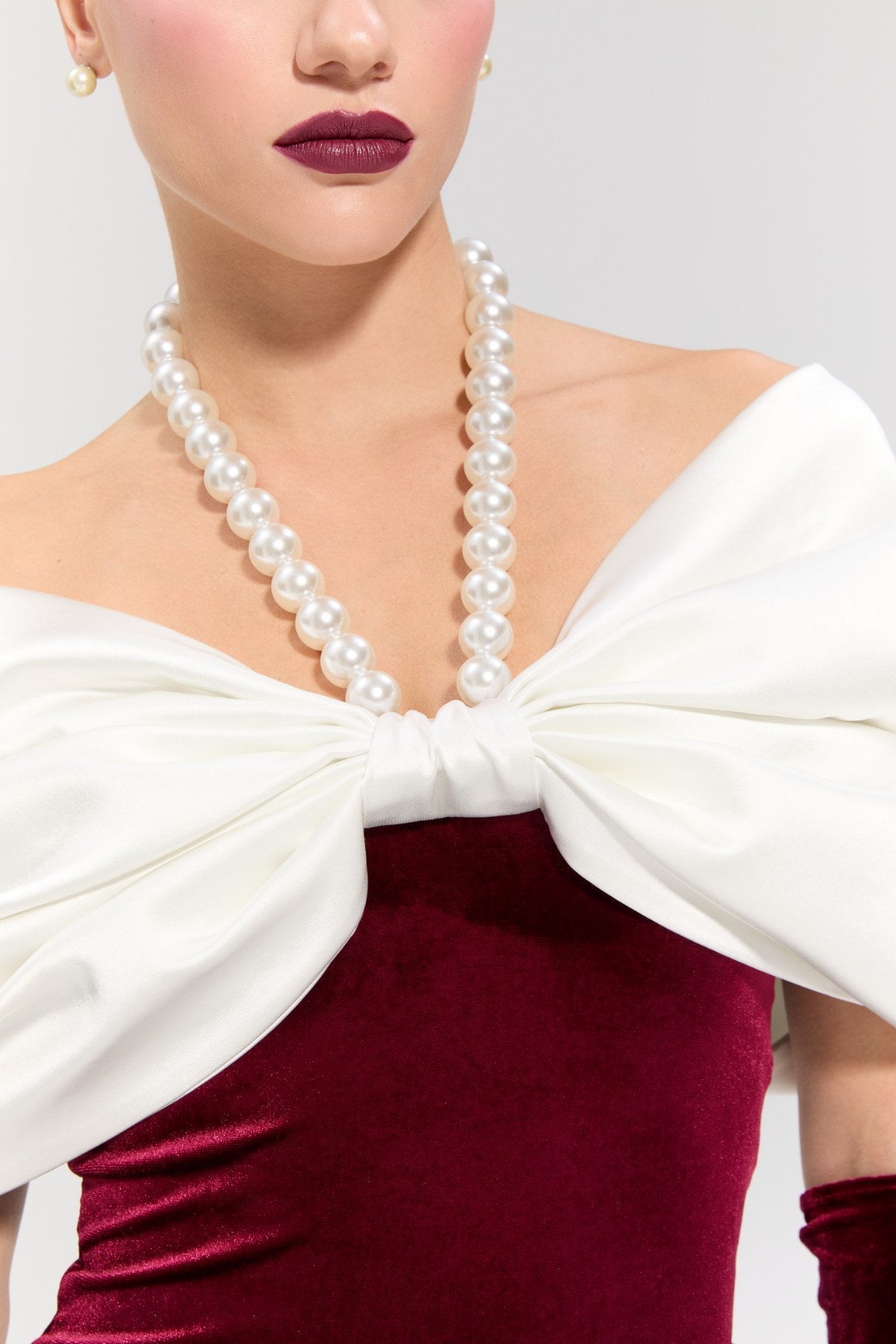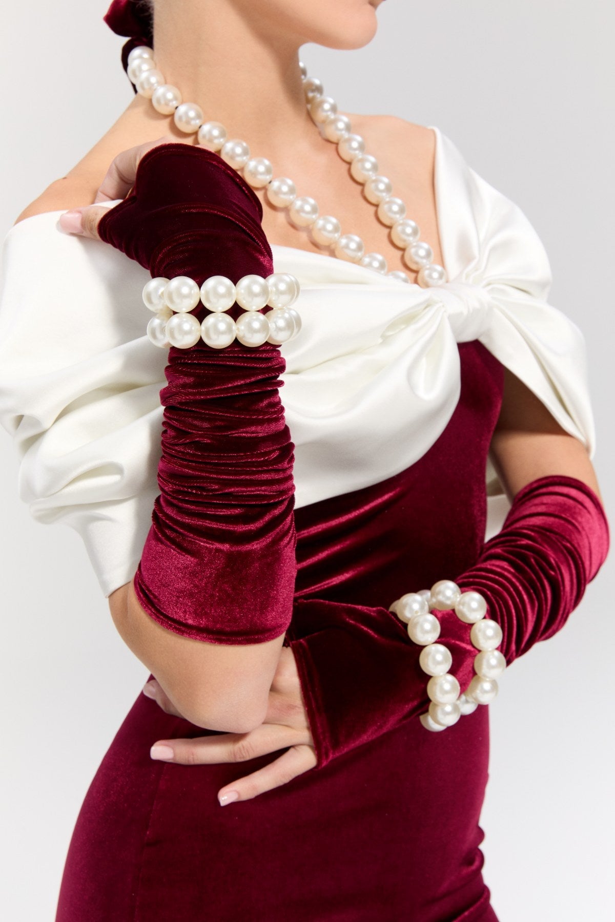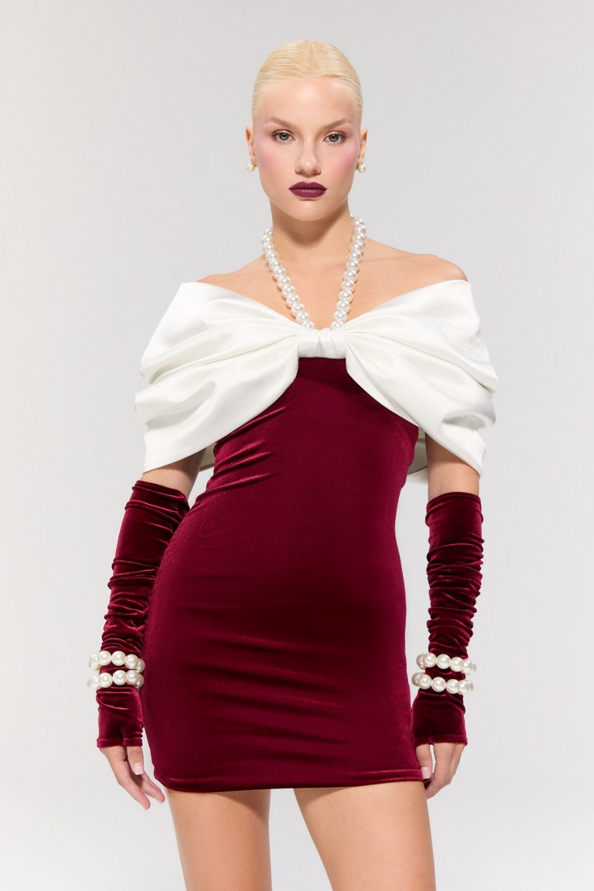 The mini burgundy velvet fabric adds a sophisticated touch with its body-hugging cut, while the large white bow detail on the satin fabric shoulder provides a dynamic contrast.