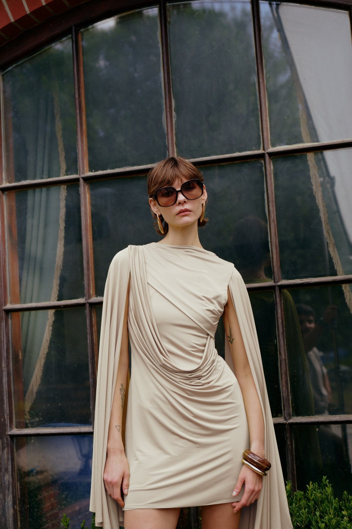 Model: Draped cape detail mini dress