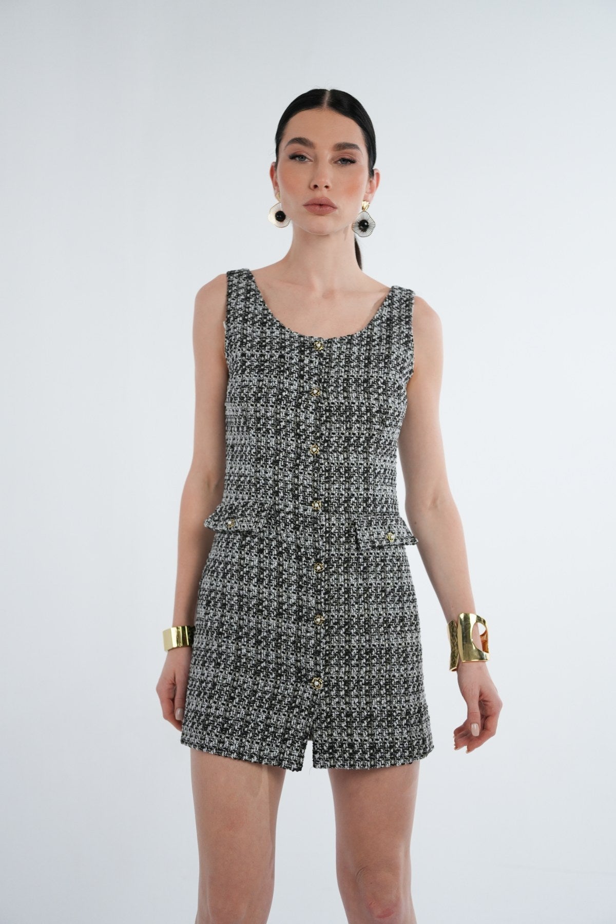 Black and white soft tweed dress with pearls and flower-shaped black and gold button details.