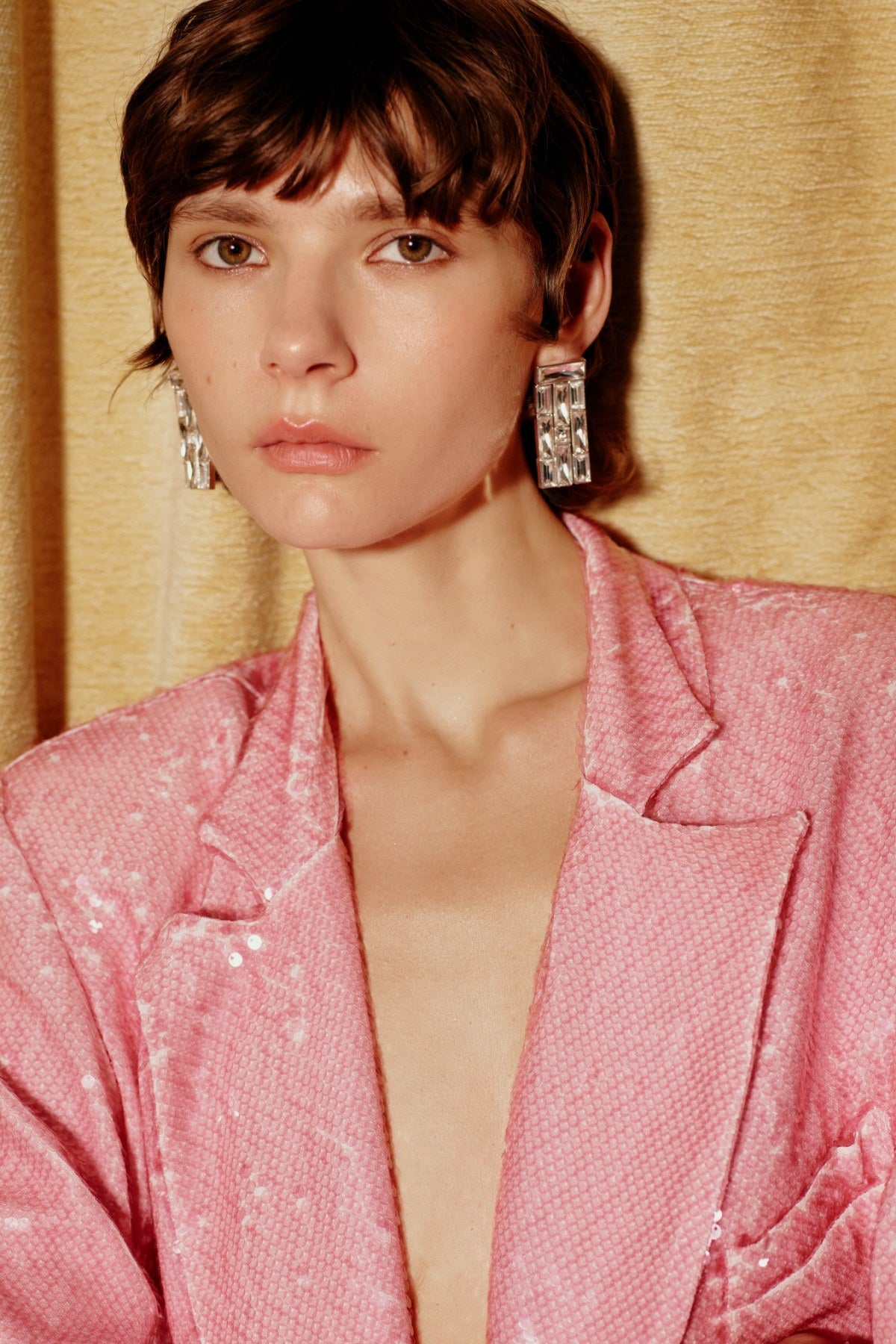 Technical Details Model: Straight cut mini skirt Pattern: Fitted silhouette Material: Pink sequin embroidered fabric Lined Details: Sequin embroidery covering the entire surface Minimal and modern form Hidden back zipper closure Length: Mini Color: Rose pink