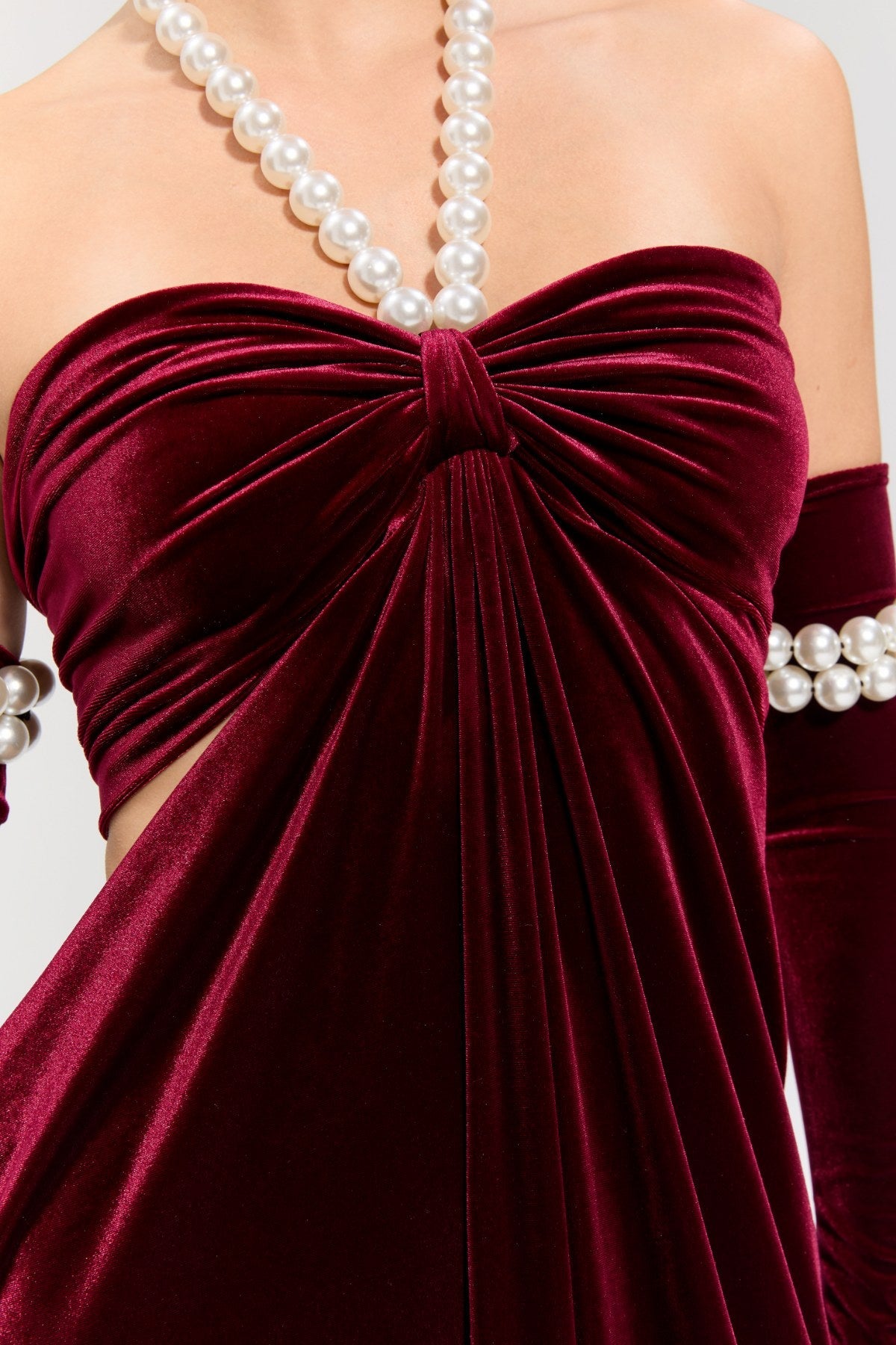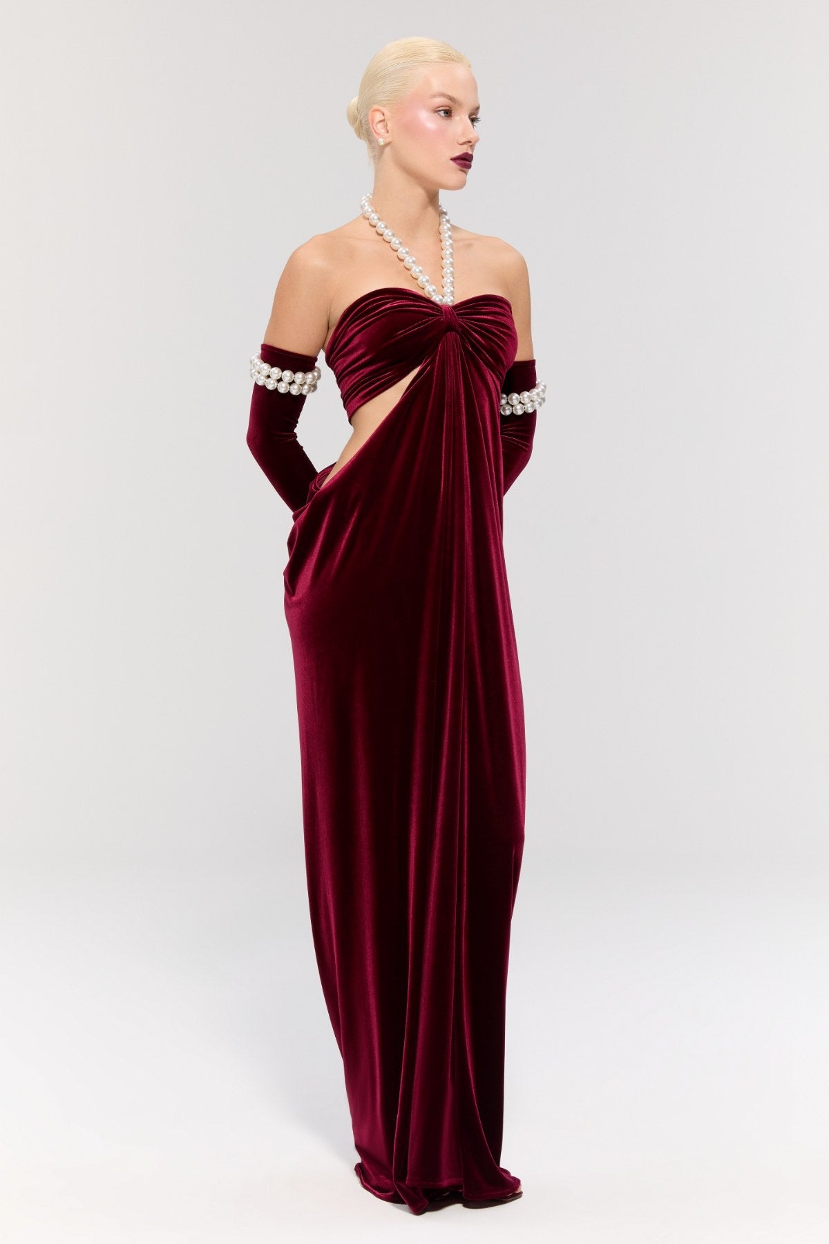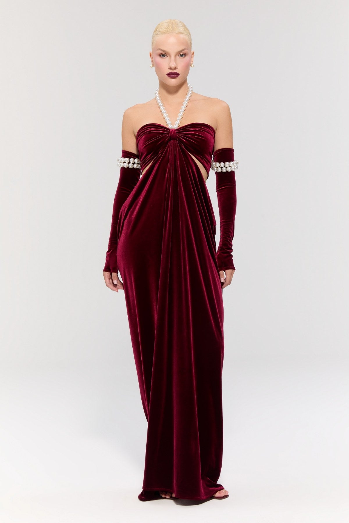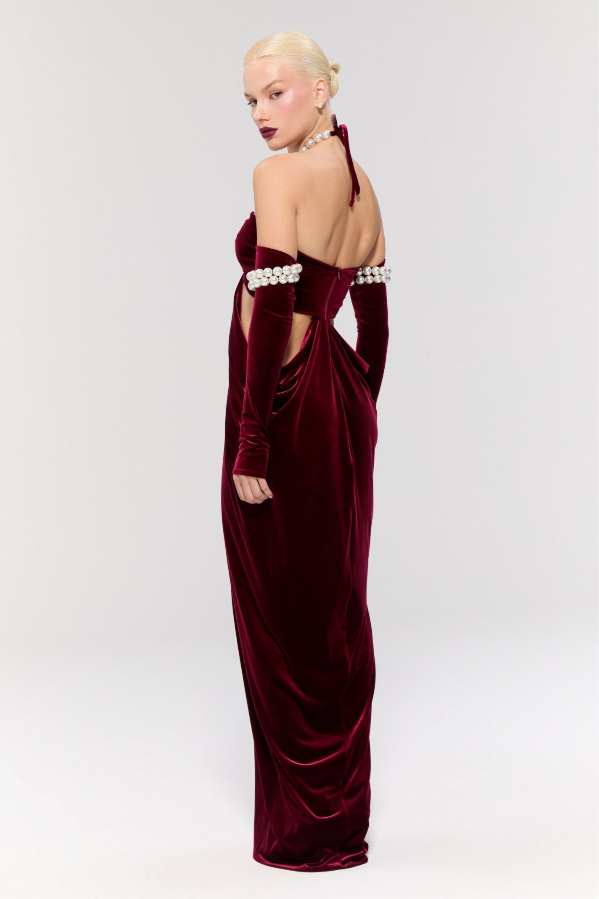 The dress exudes sophisticated elegance in its burgundy velvet fabric.