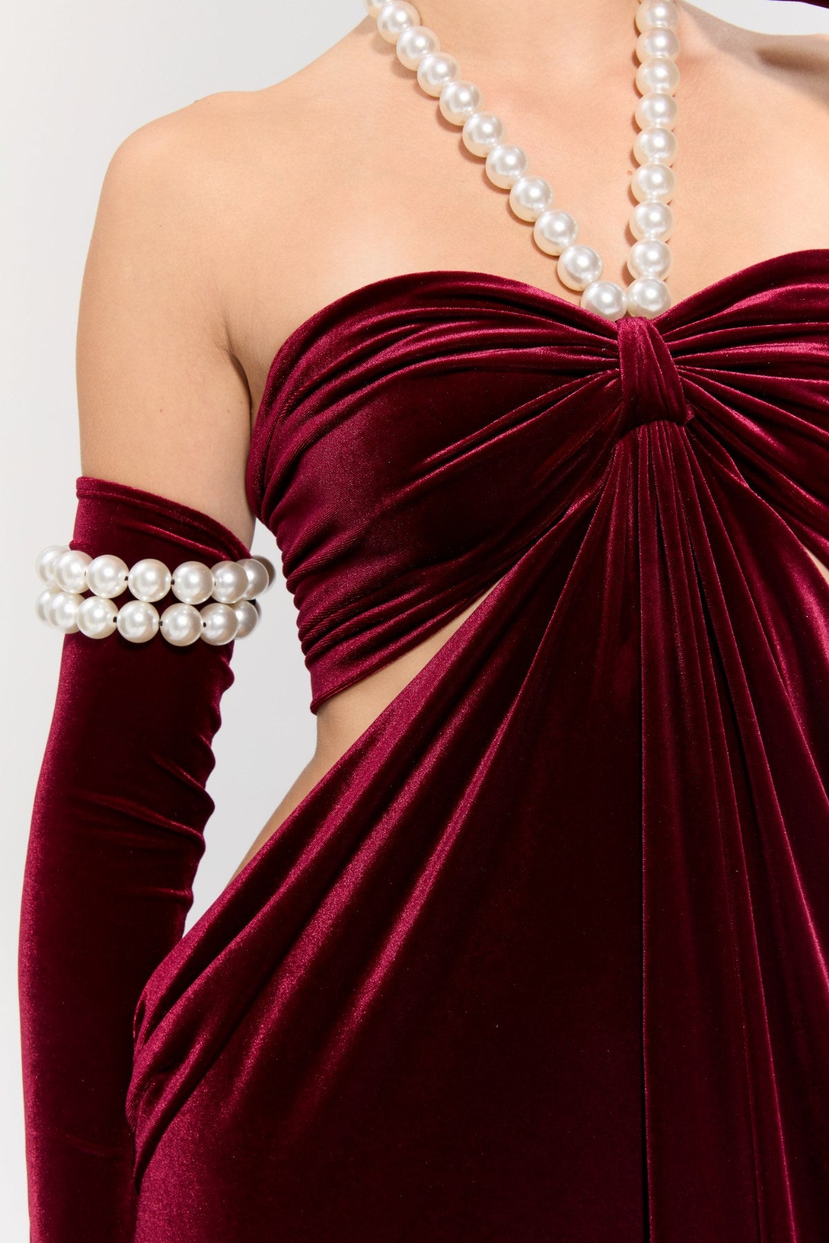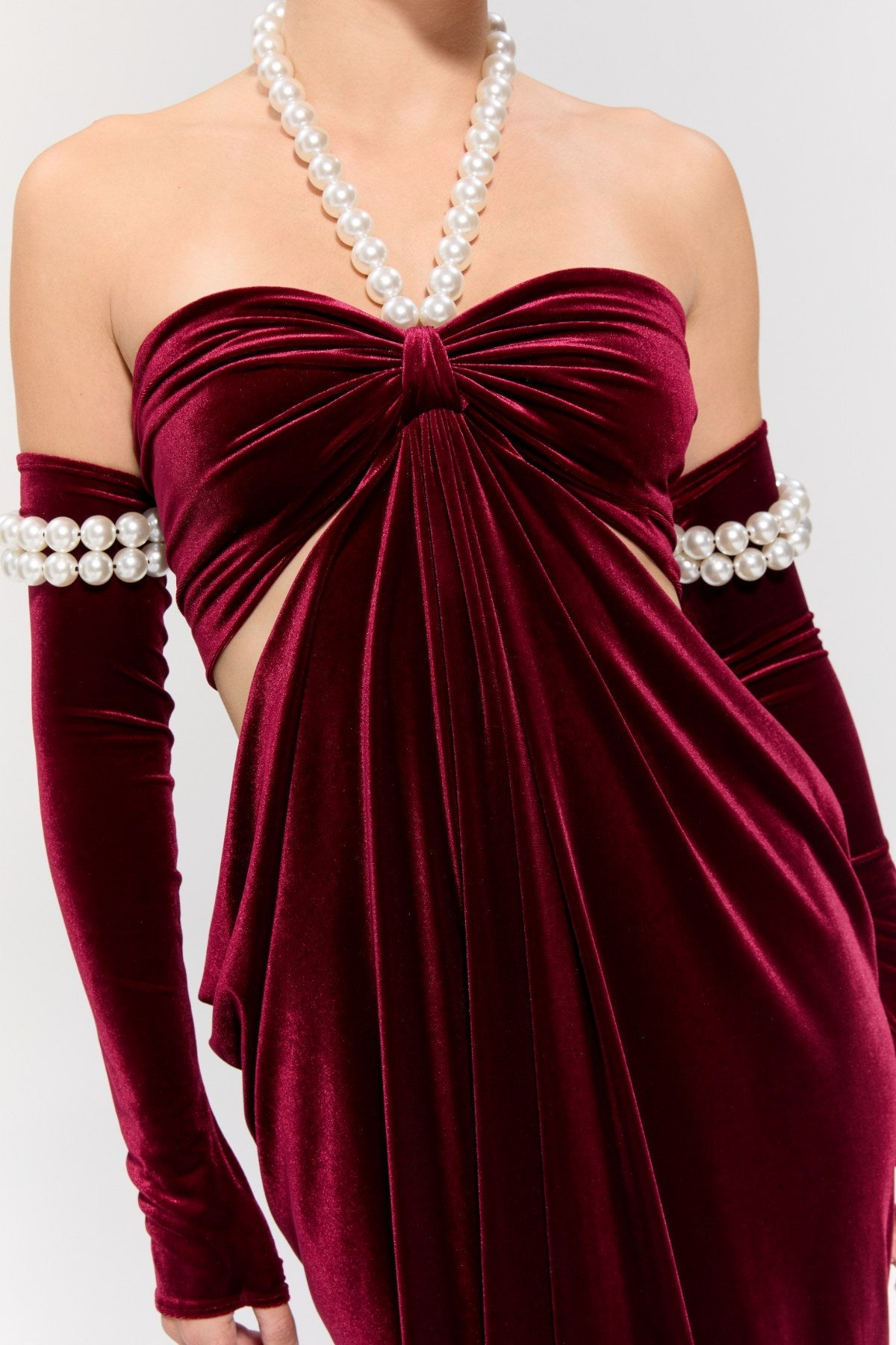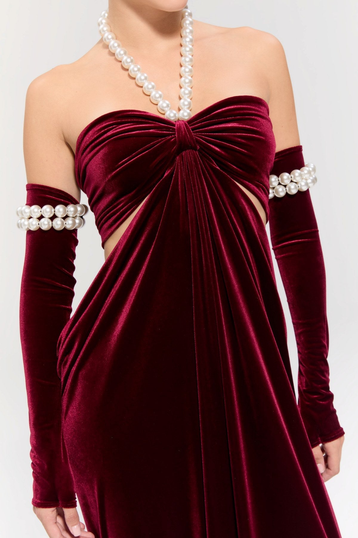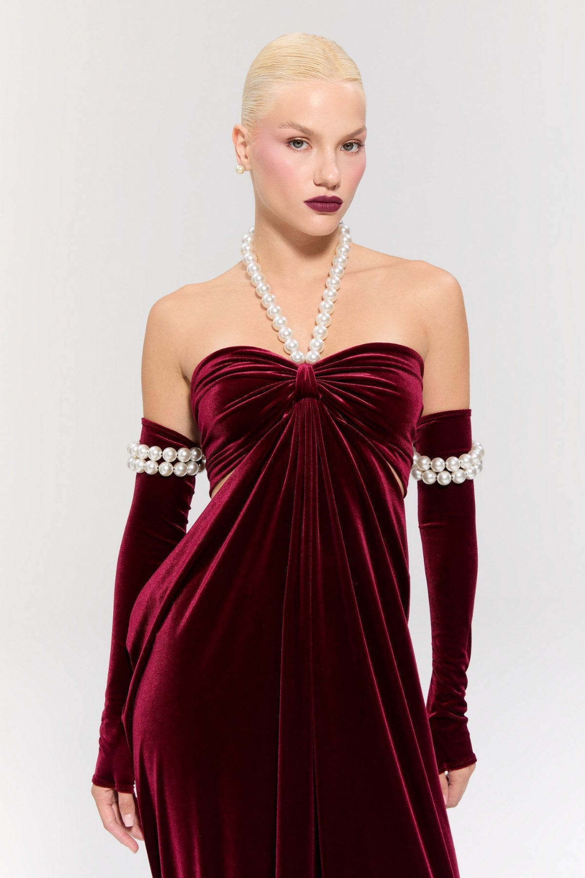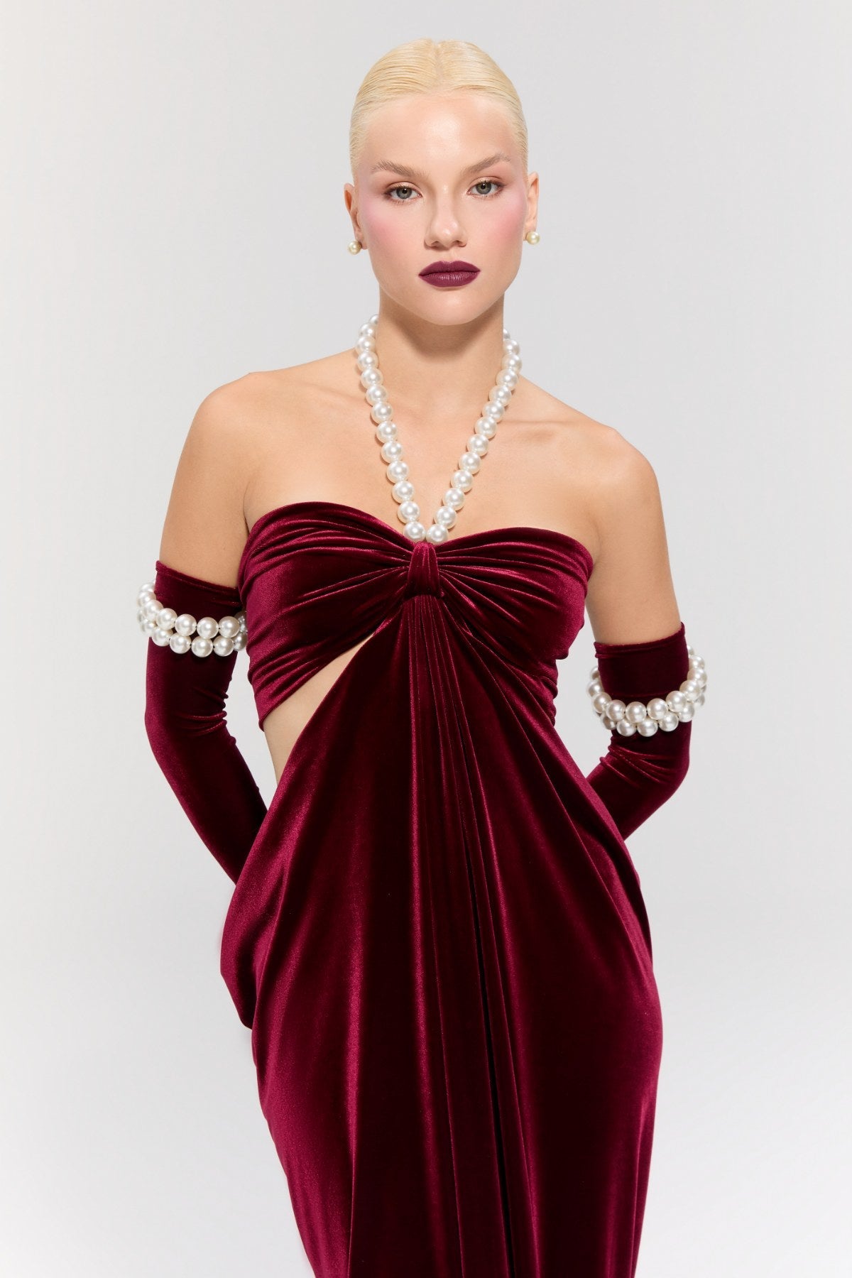 The dress exudes sophisticated elegance in its burgundy velvet fabric.