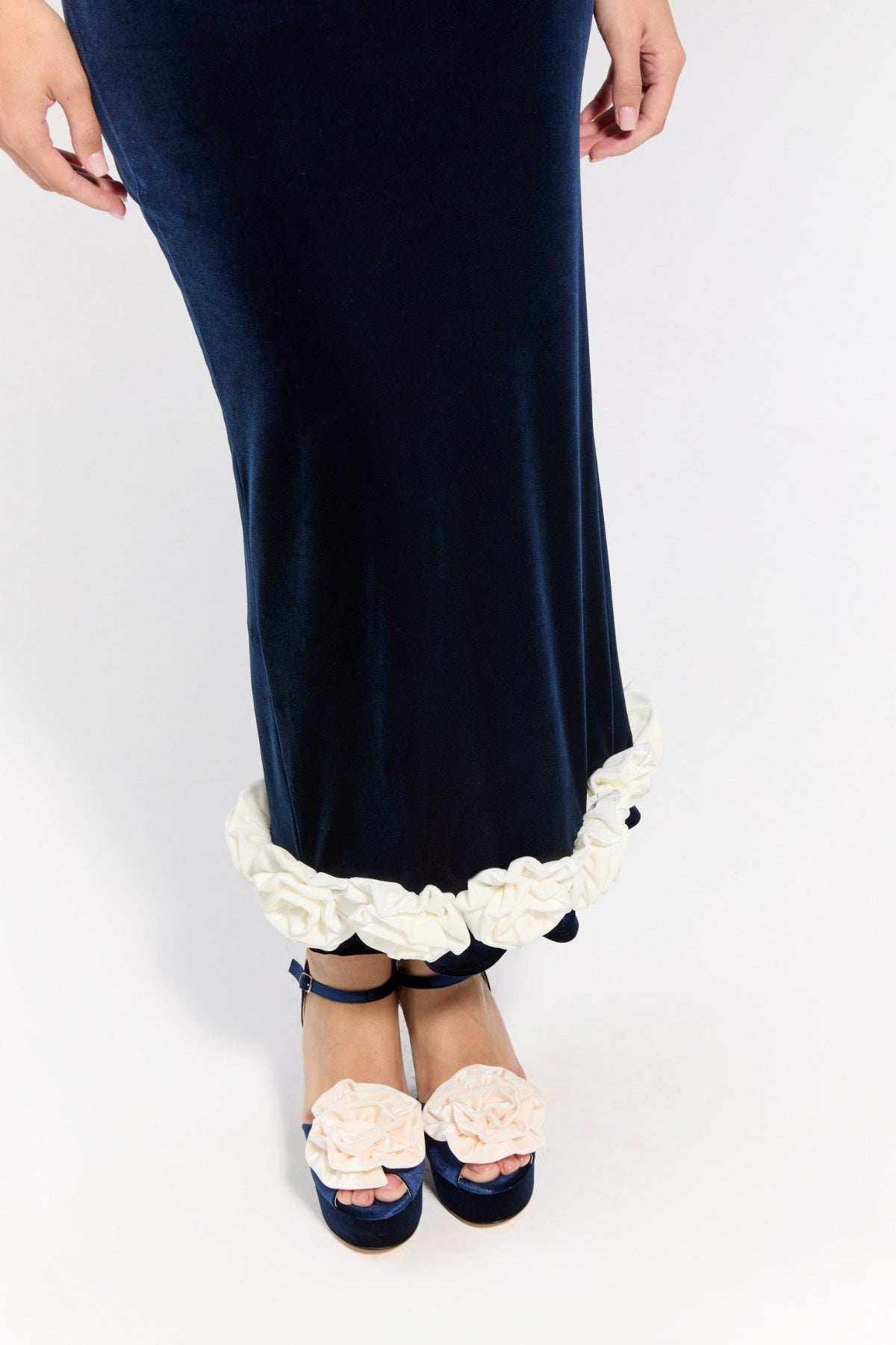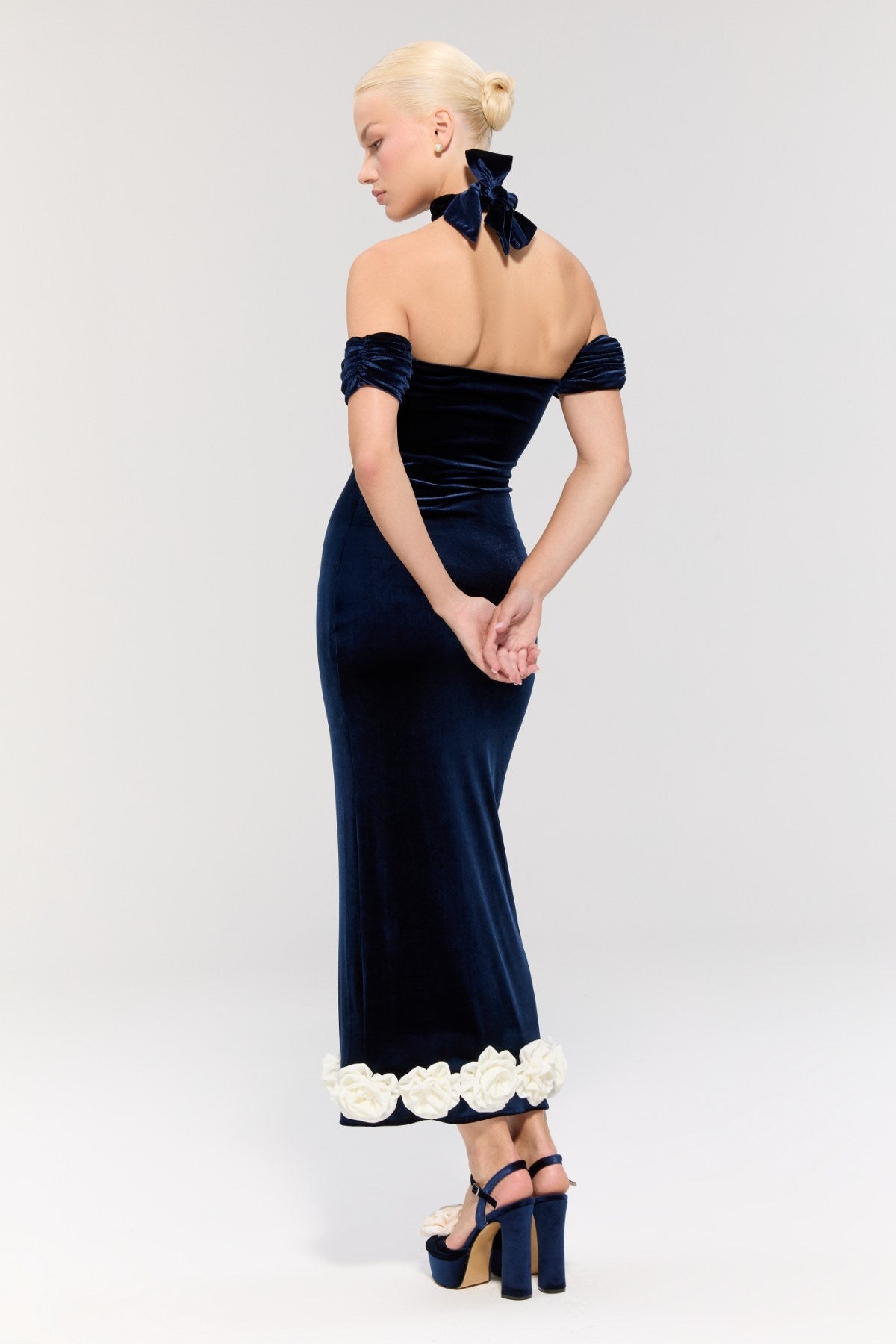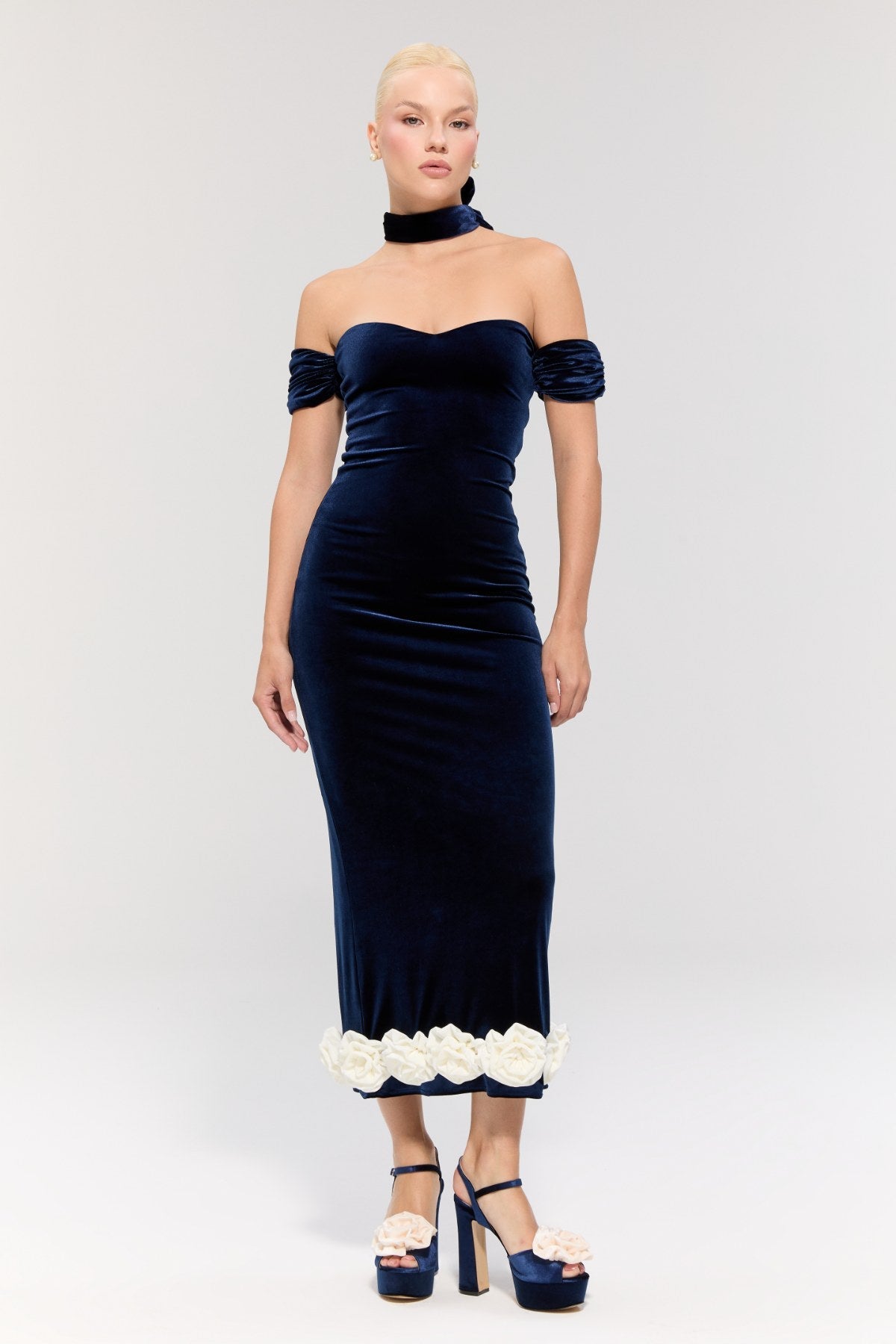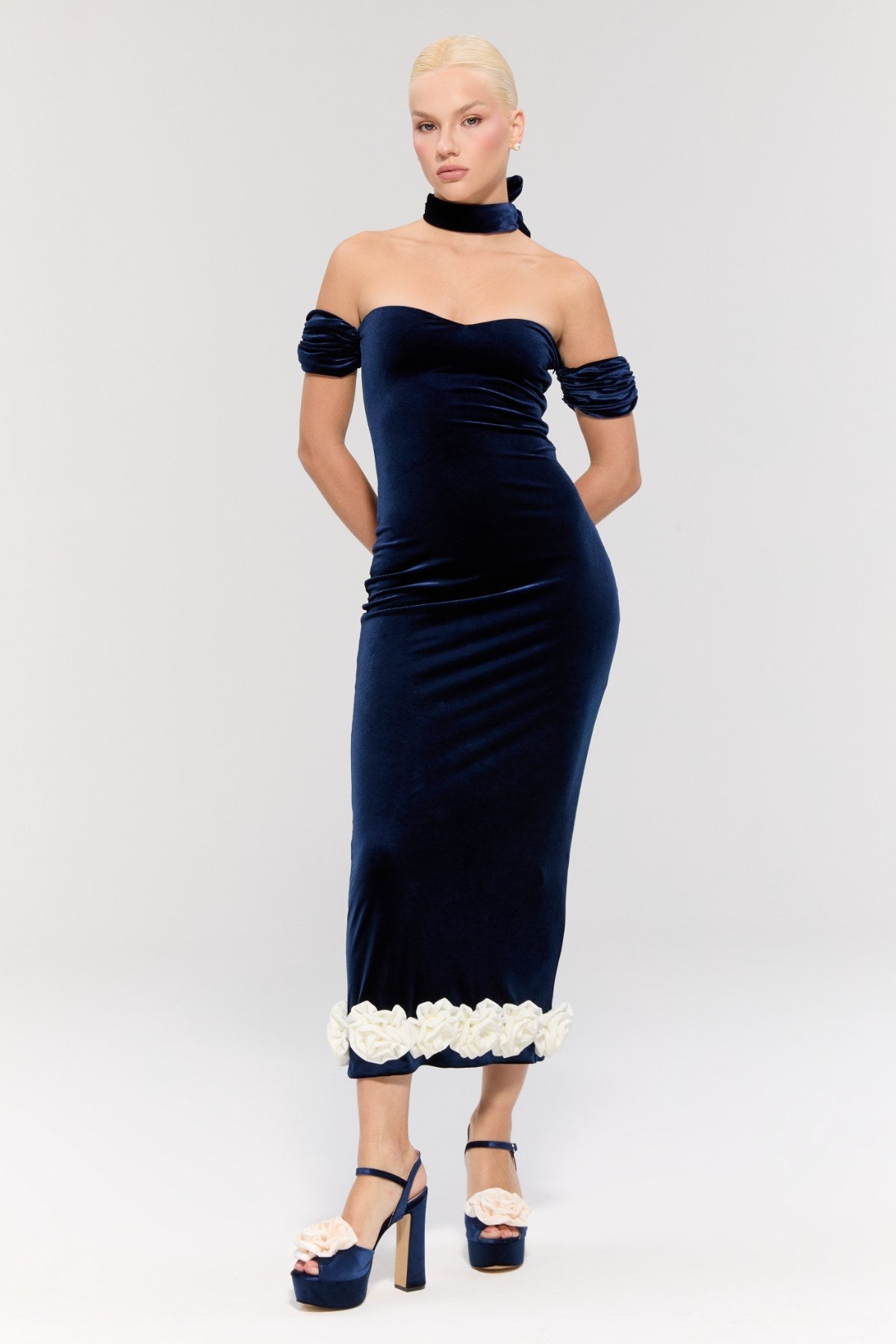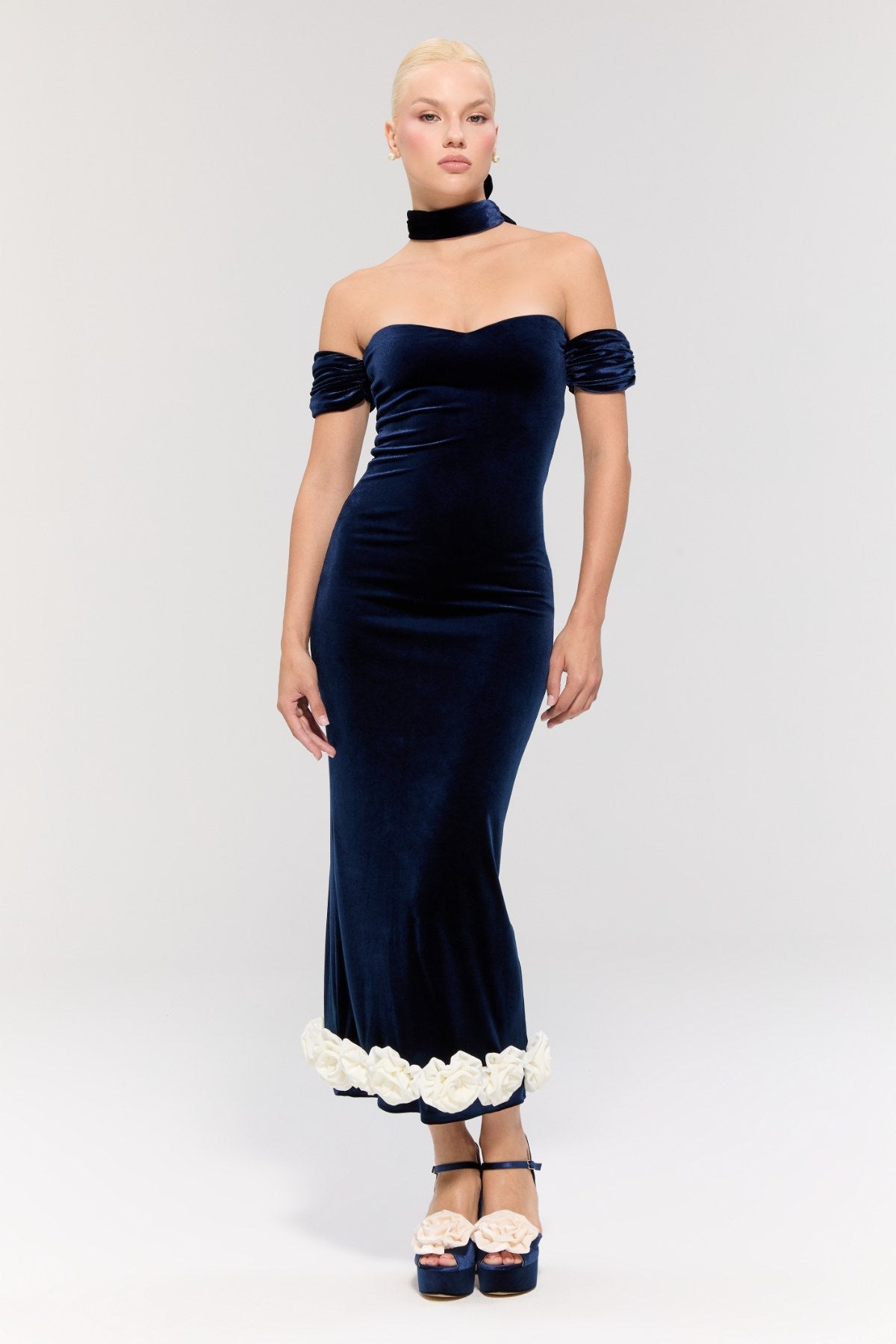 The midi-length design creates an elegant silhouette, while the white rose detail at the hem adds a romantic and striking touch.