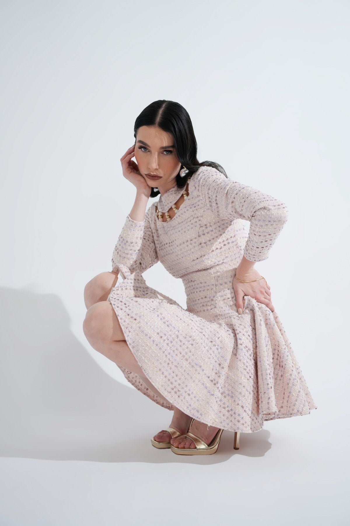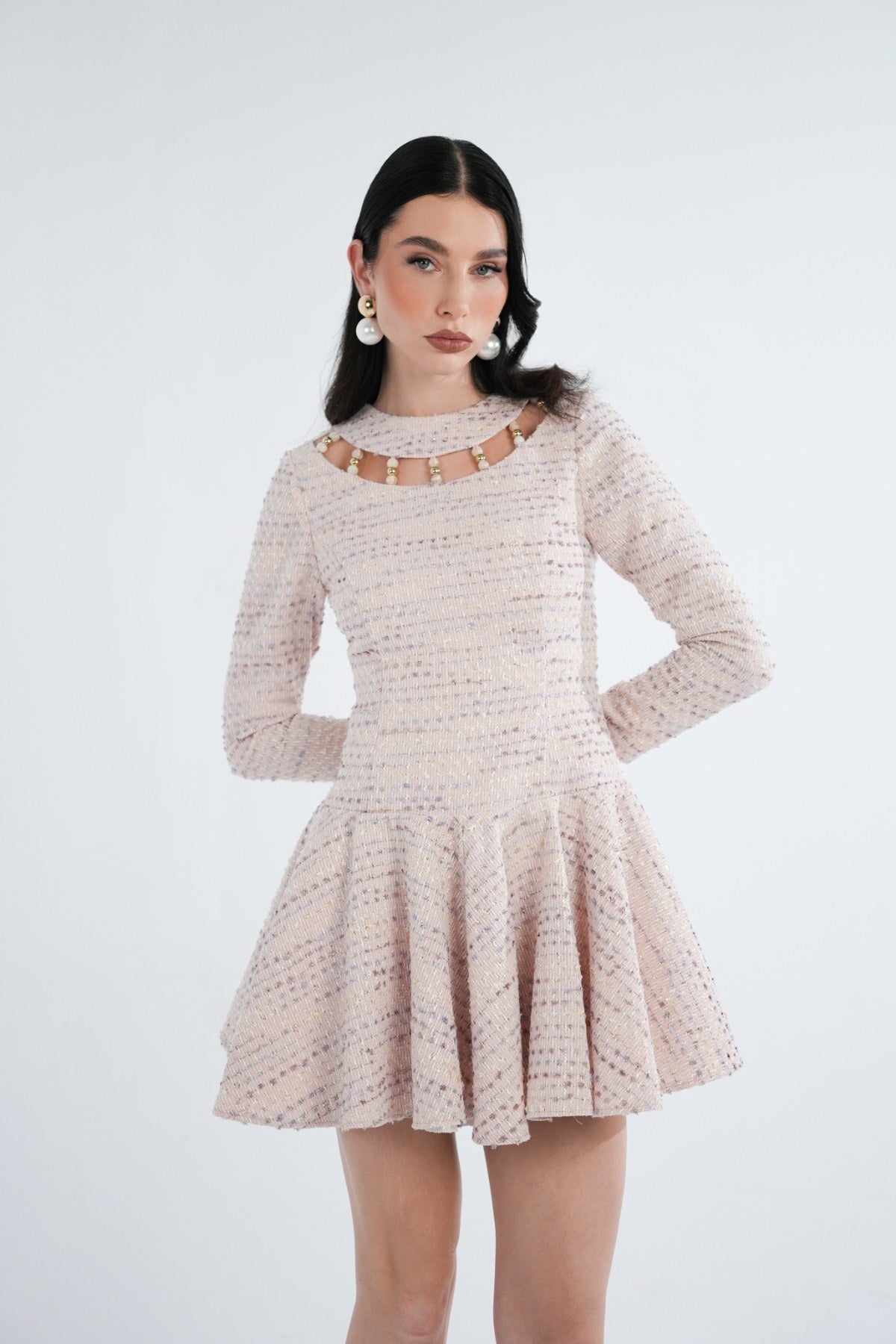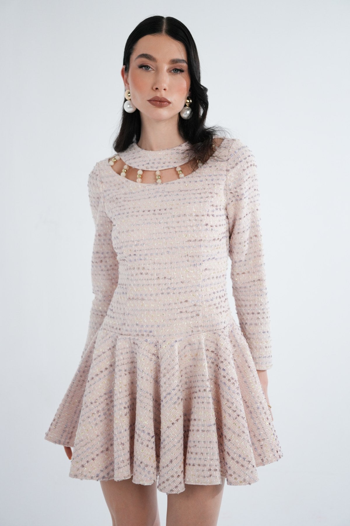 A soft pink tweed dress with window detailing, beads, and ribbon detailing.