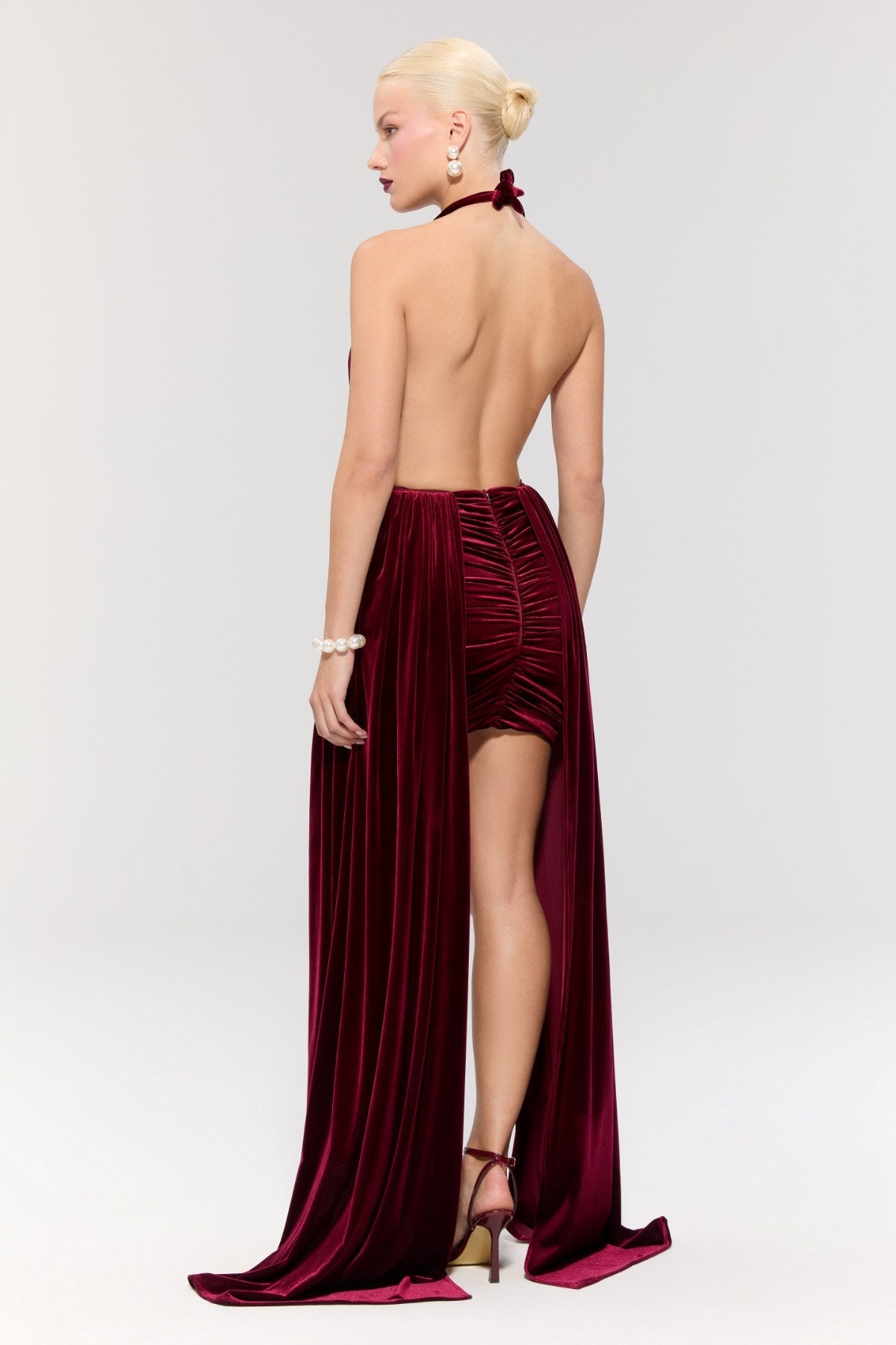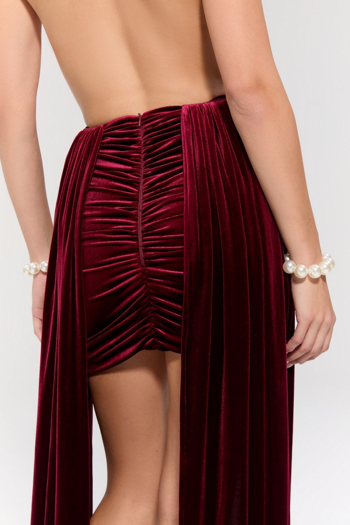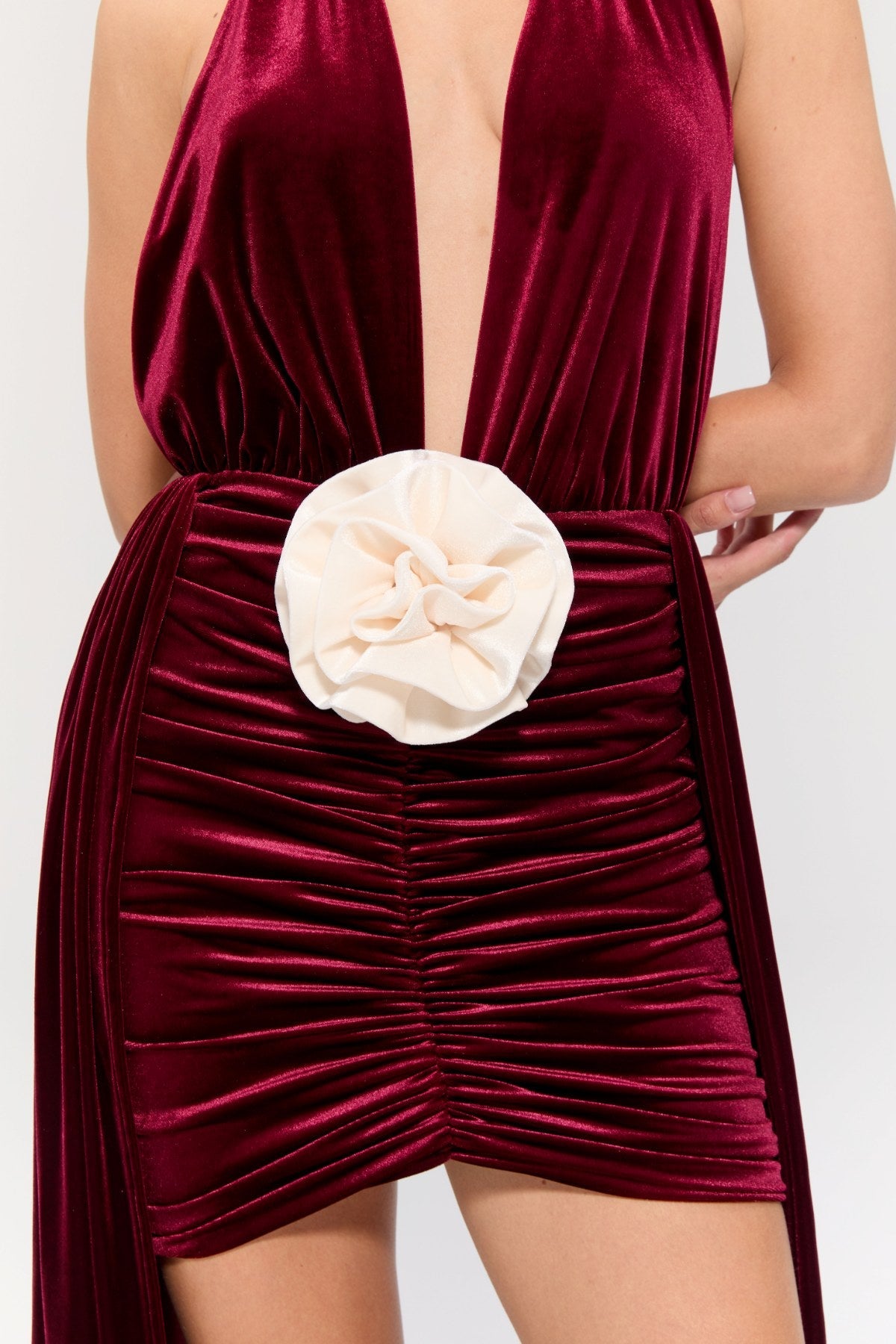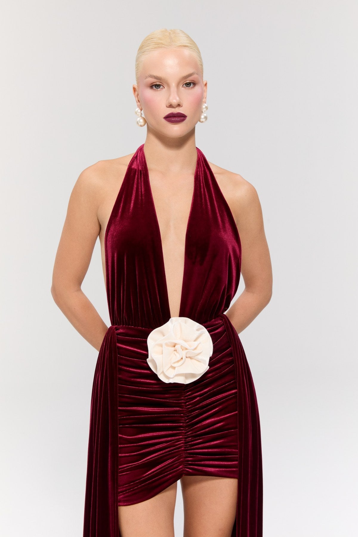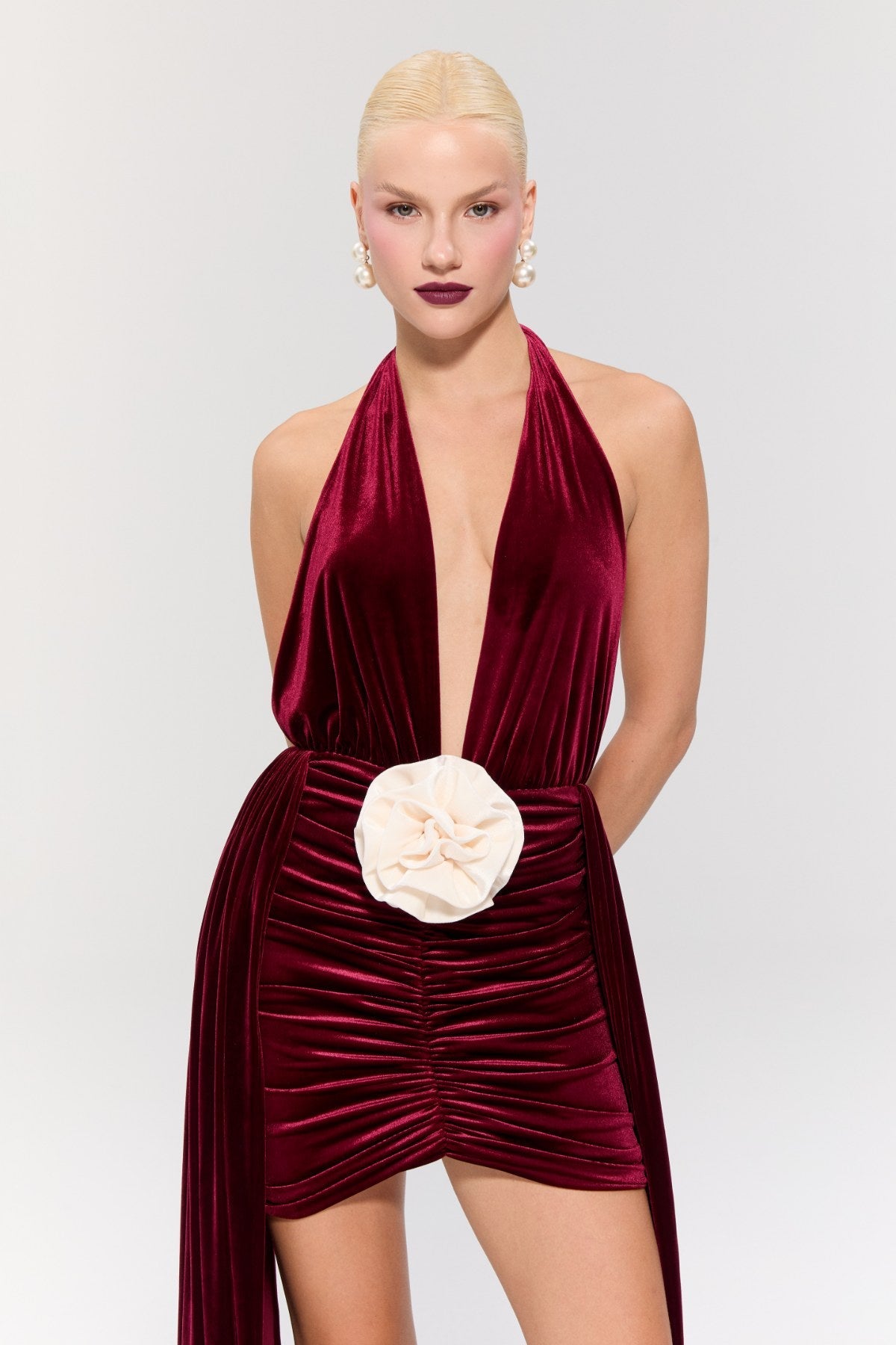 This burgundy velvet dress offers a modern and chic silhouette with its mini length.