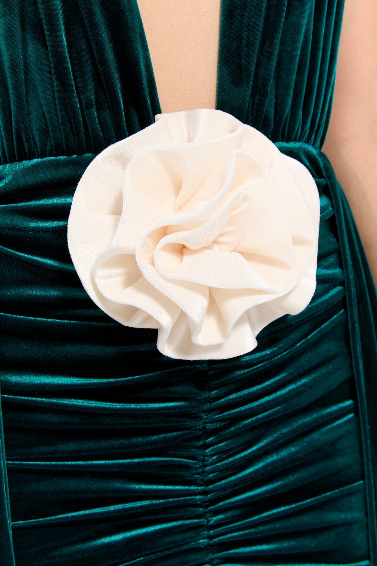 A white rose detail at the waist adds a touch of elegance, while the hanging fabric pieces at the sides complete the design by adding movement and volume.