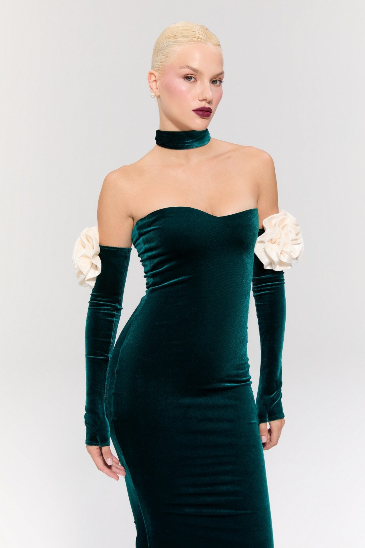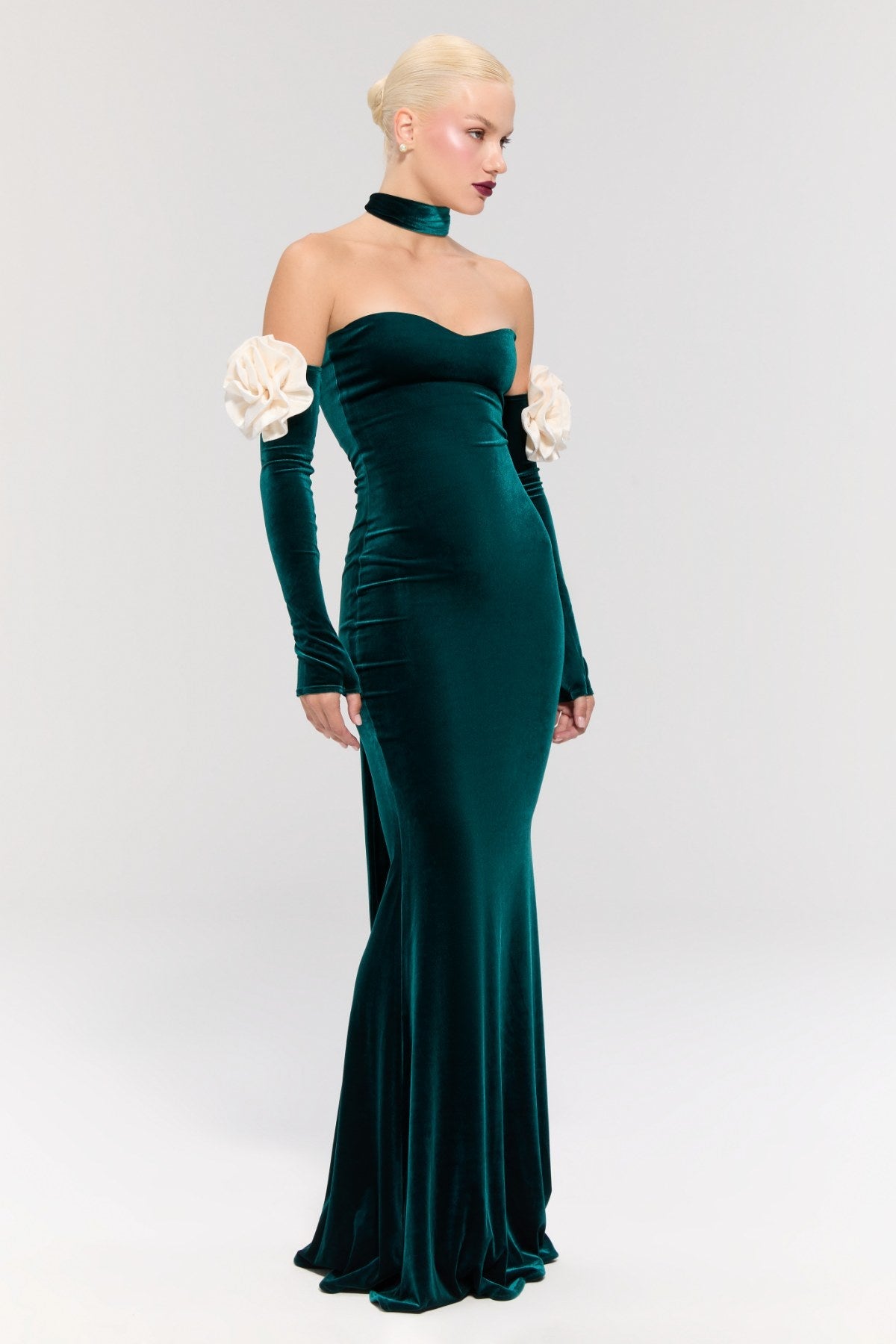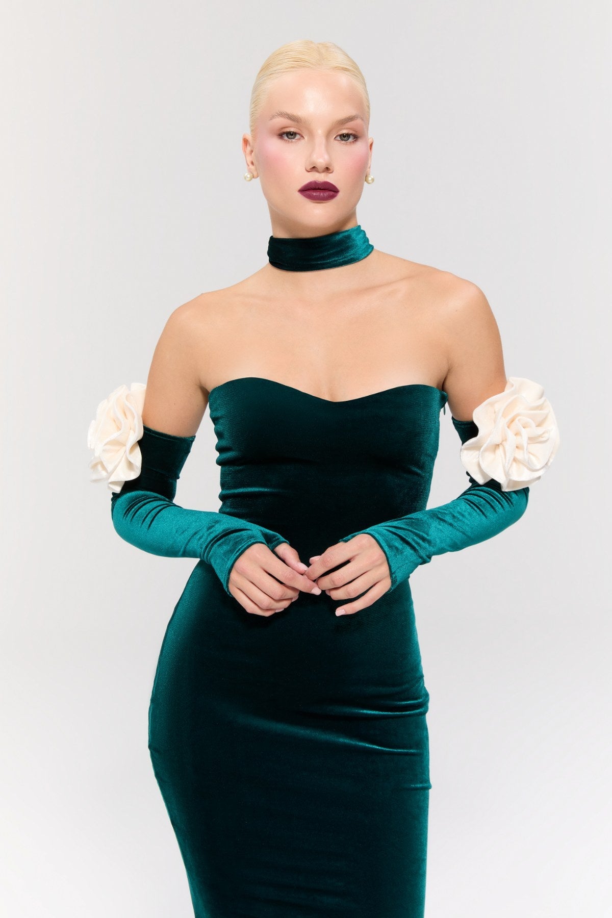 The dress offers a sophisticated look with its green velvet texture, while the mermaid cut creates an elegant silhouette.