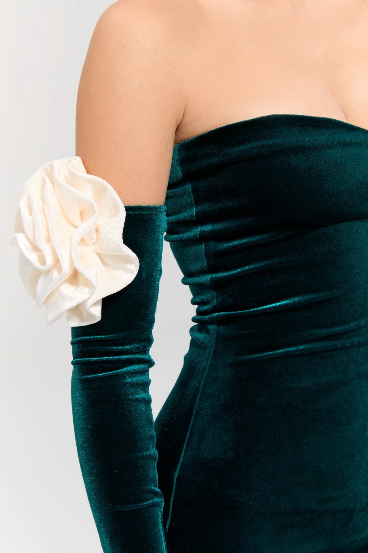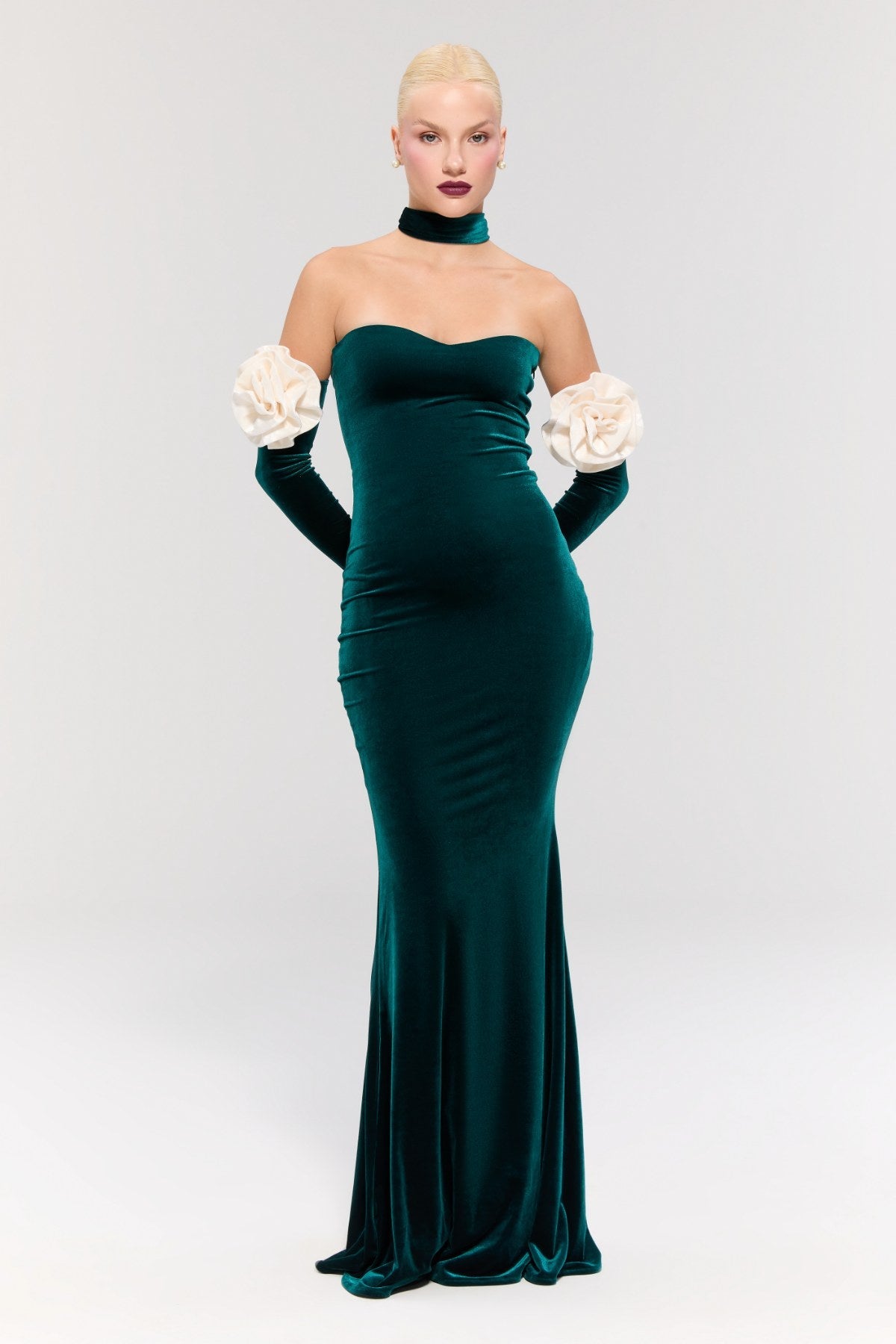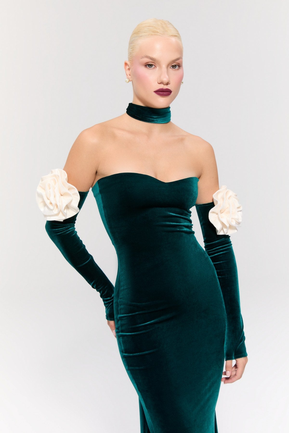 The dress offers a sophisticated look with its green velvet texture, while the mermaid cut creates an elegant silhouette.